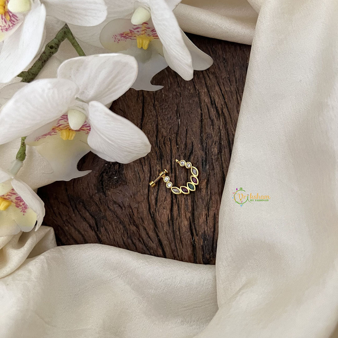 The Vriksham Designer Bridal Naths Nose Pin in red, white, and green is crafted for the right side, blending traditional elegance with modern design. Its vibrant colors and intricate detailing make it an exquisite choice for bridal wear, adding a sophisticated and graceful accent to your special day ensemble.