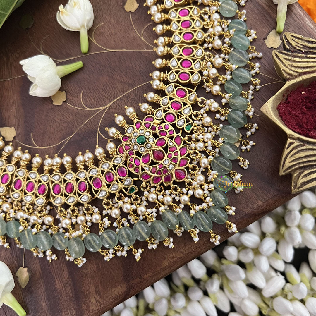 The Vriksham Designer Choker Style Kundan Jadau Short Neckpiece, adorned with aqua green beads, offers a perfect blend of contemporary design and traditional craftsmanship. Its intricate Kundan detailing and chic choker silhouette create a sophisticated statement piece that enhances any elegant outfit, ideal for special occasions and celebrations.