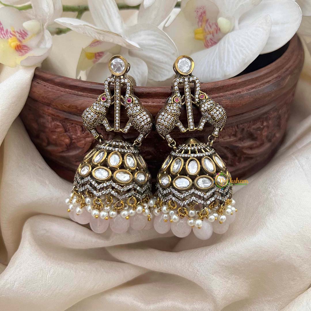 Elevate your ethnic ensemble with these exquisite designer jhumkas, where timeless Victorian craftsmanship meets contemporary artistry. Featuring dual elephant motifs adorned with lustrous pinkish-white beads and sparkling diamond accents, these chandelier earrings embody refined elegance. The intricate detailing showcases traditional jhumka design elevated through premium materials and meticulous craftsmanship. Perfect for weddings, festive celebrations, or special occasions, these statement pieces add a touch of regal sophistication to any traditional or fusion outfit. A treasured addition to your jewelry collection that celebrates heritage with modern sensibility.