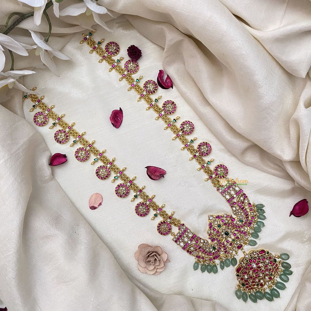 Indulge in luxury with our Vriksham Designer Dual Peacock Pendant Neckpiece. Featuring intricate dual peacock pendants and a stunning pastel green bead, this neckpiece exudes elegance and sophistication. Elevate your style with this one-of-a-kind piece, perfect for any occasion.