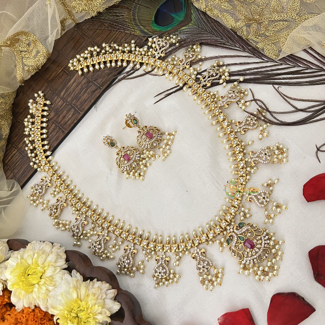 The Vriksham Designer Dual Peacock Style Guttapusalu Long Neckpiece features an exquisite dual peacock motif adorned with lustrous pearls. This sophisticated necklace blends traditional artistry with elegant design, making it a perfect accessory to elevate your formal and festive attire.