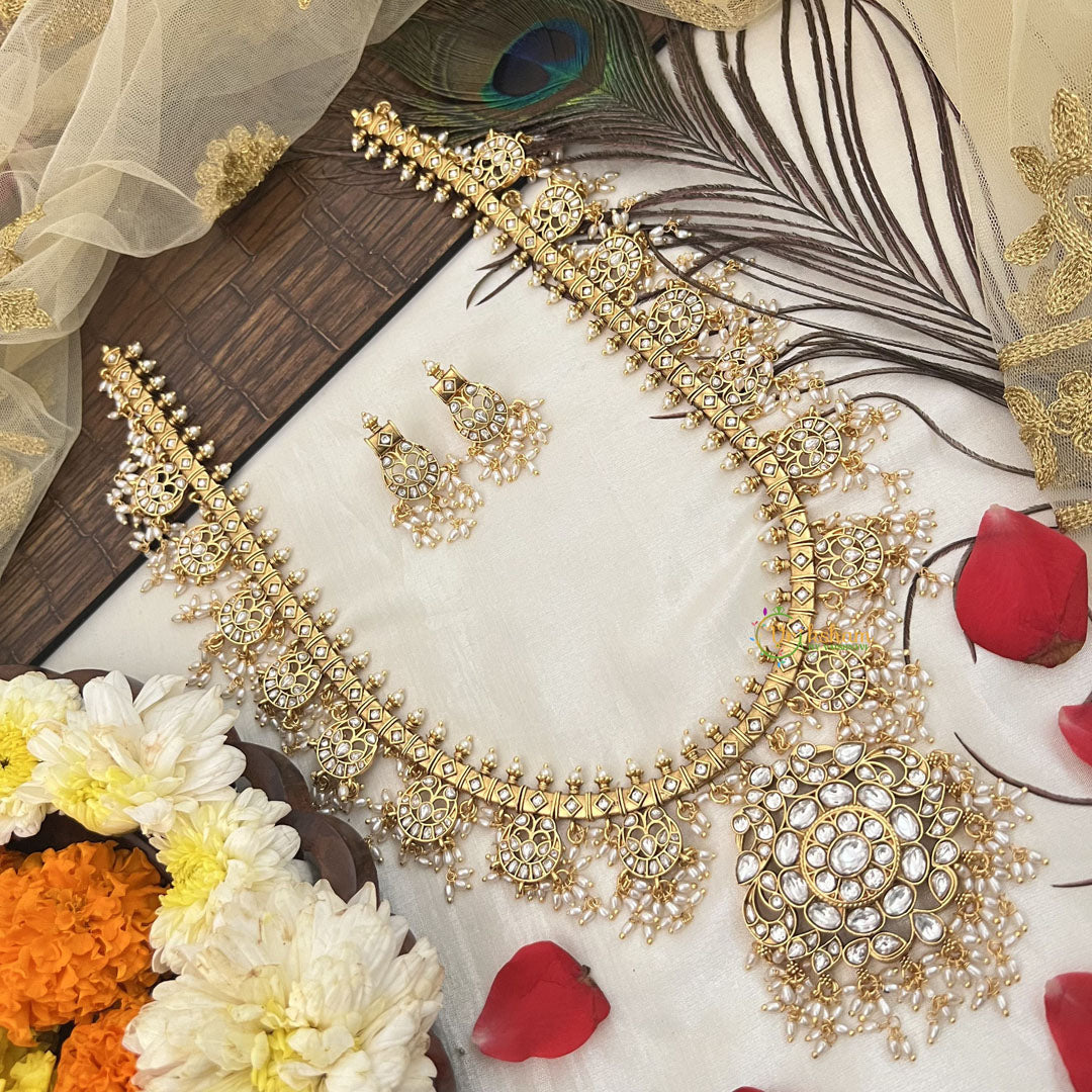 The Vriksham Designer Dual Peacock Style Guttapusalu Long Neckpiece features an elegant dual peacock motif intricately crafted and adorned with delicate white rice pearls. This sophisticated piece combines timeless traditional design with refined detailing, making it an exquisite choice to enhance your formal and festive wardrobe.