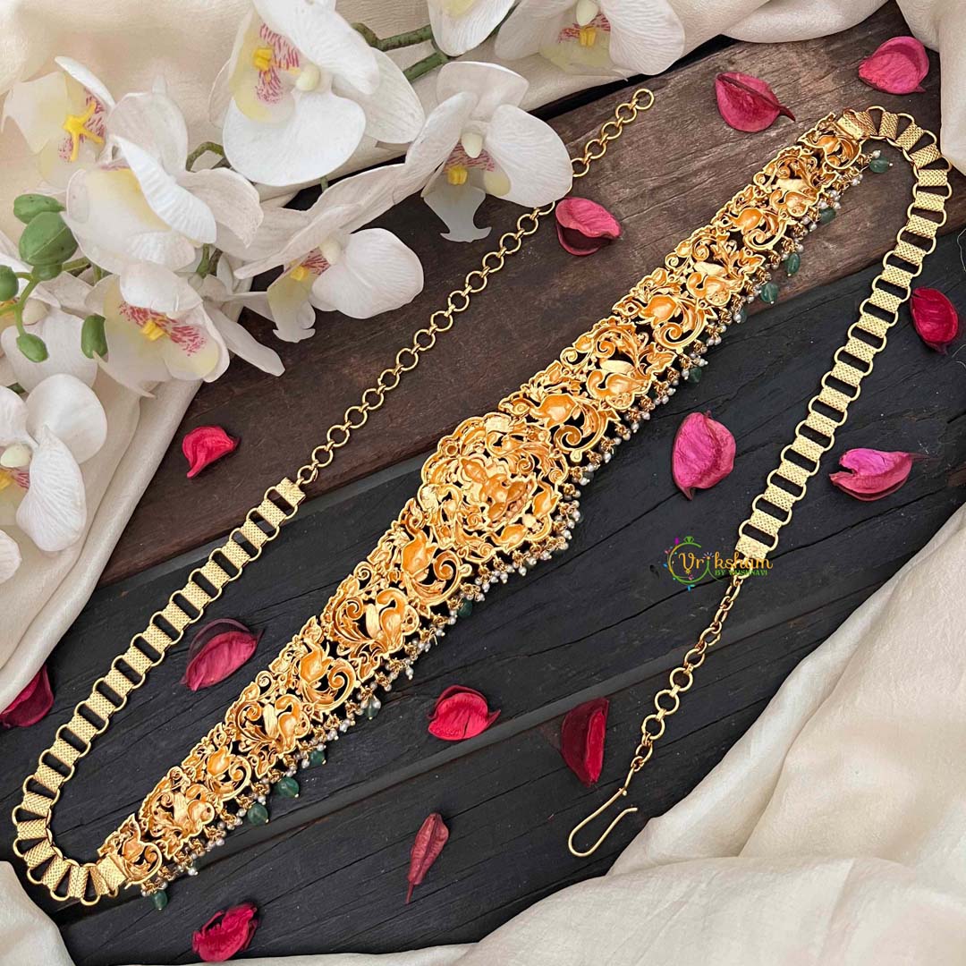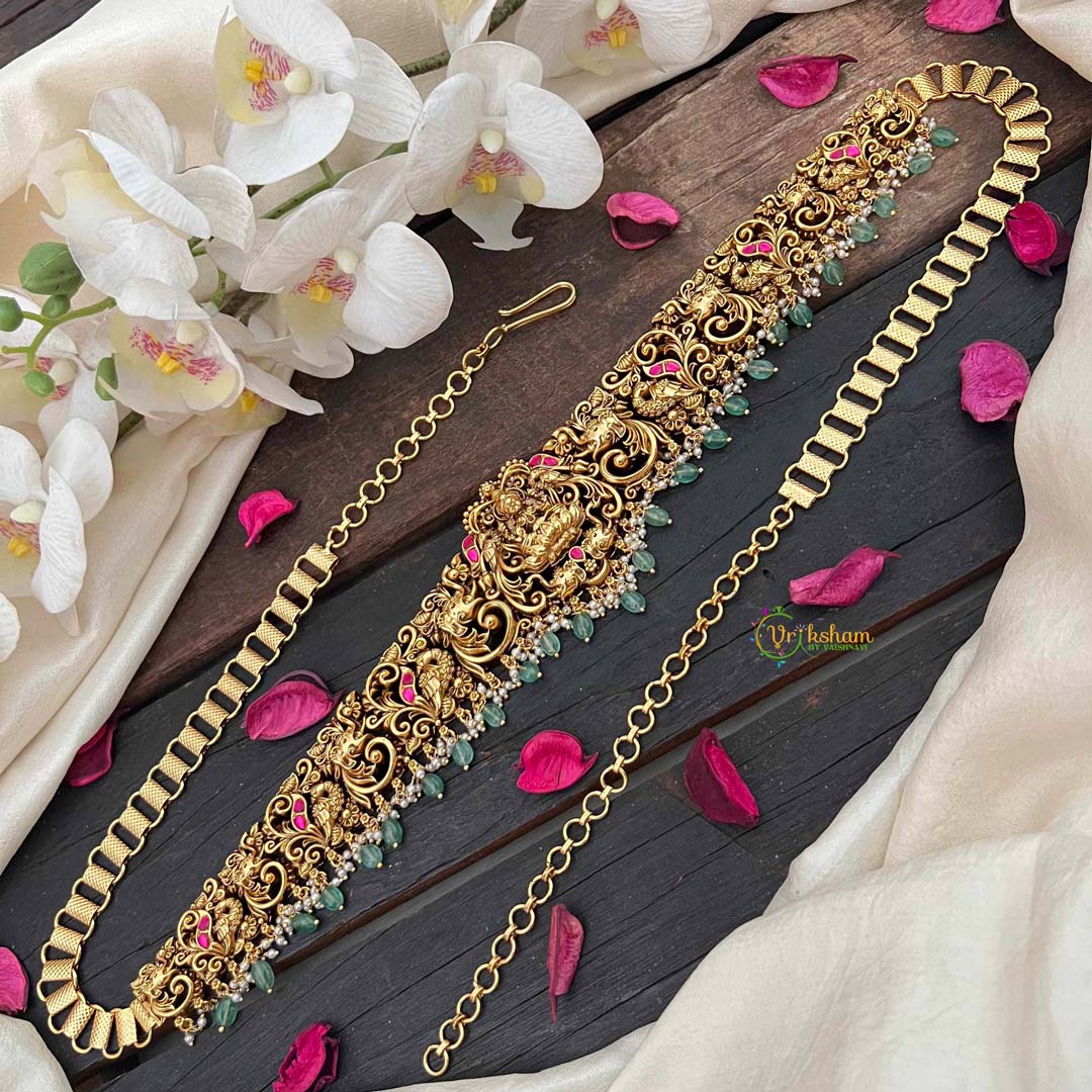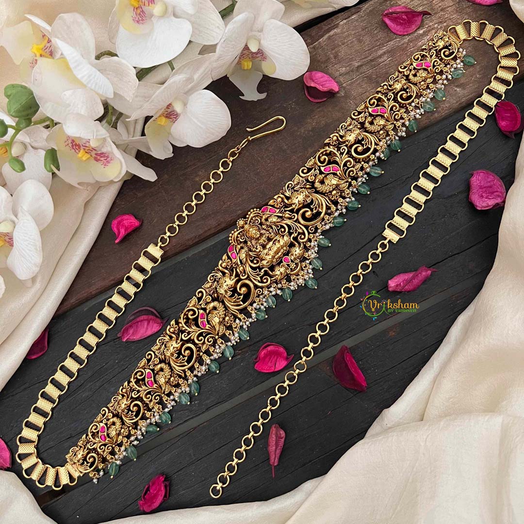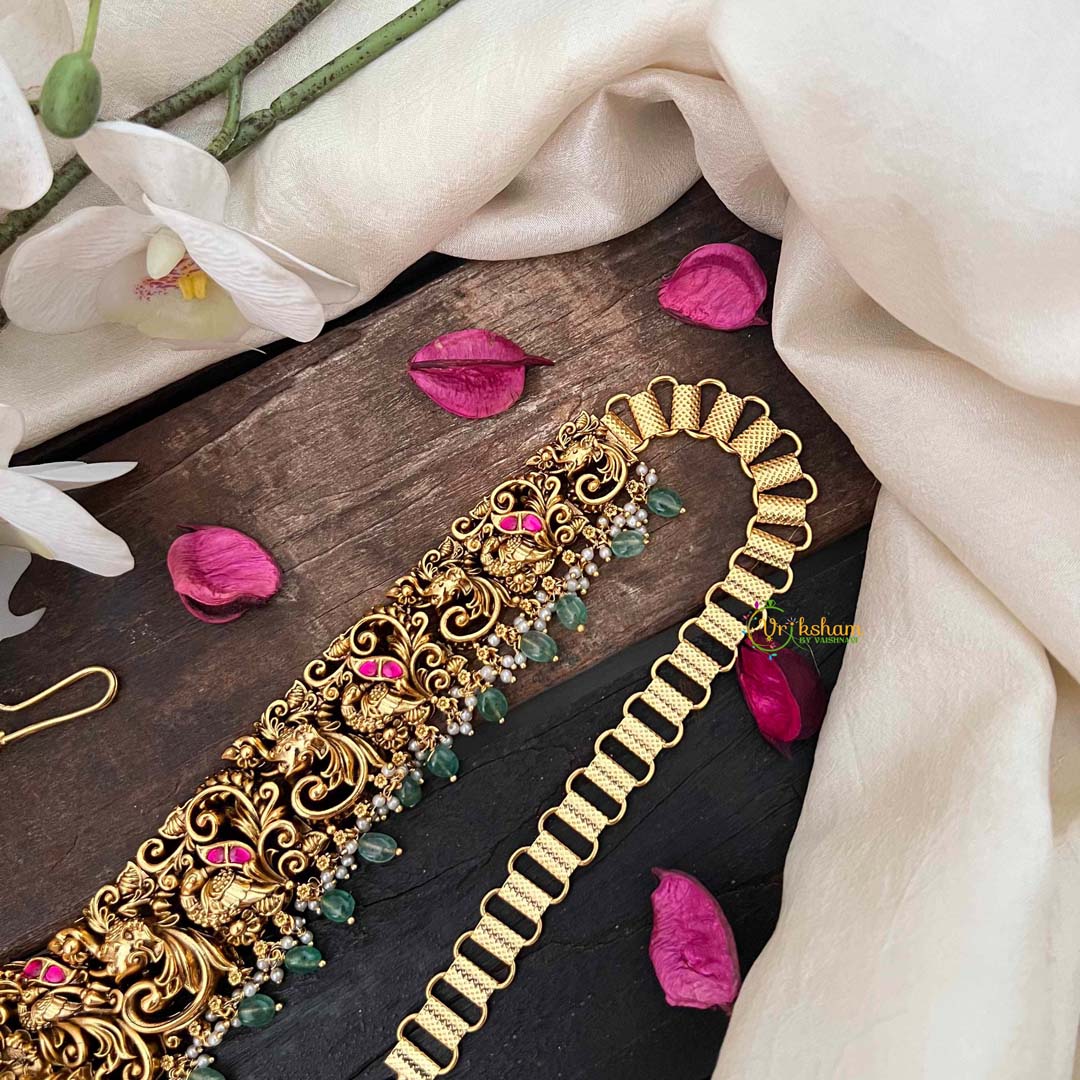 Embrace timeless beauty with this Designer Elephant & Lakshmi With Leaf Nakshi bridal hipchain, featuring a striking red base adorned with vibrant green beads. The masterfully executed nakshi detailing brings to life the auspicious elephant and Lakshmi motifs, interwoven with delicate leaf patterns that evoke natural grace. Each bead is thoughtfully placed to create a balanced composition that celebrates prosperity and abundance. This artisanal piece represents the pinnacle of traditional craftsmanship, offering brides a distinctive accessory that seamlessly blends spiritual symbolism with refined elegance. Perfect for those seeking an authentic, culturally resonant addition to their bridal trousseau that transcends fleeting trends.
