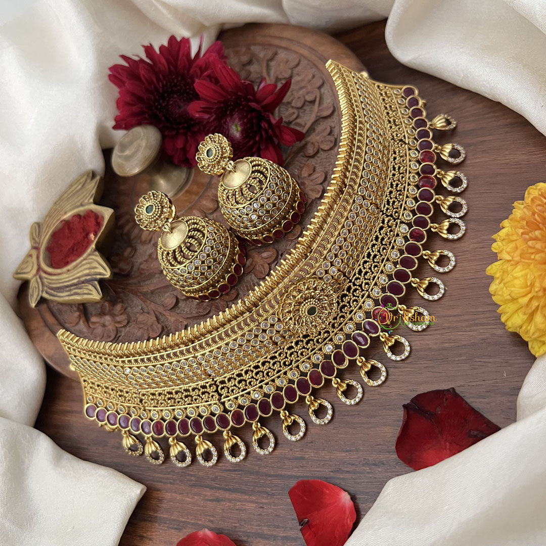 Elevate your elegance with the Vriksham Designer Floral AD Stone High Neck Choker. Featuring radiant red stones delicately set alongside shimmering gold beads, this high-neck piece exudes refined charm. Its intricate floral design adds a timeless touch, perfect for enhancing any sophisticated ensemble. Ideal for special occasions, this choker blends traditional artistry with contemporary style for a truly captivating look.