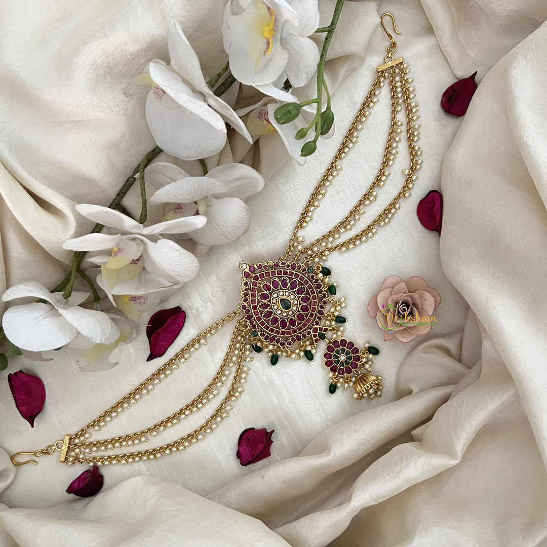 The Vriksham Designer Floral Jada Billai with Pearl Maatil is an elegant bridal accessory featuring intricate floral motifs enhanced by delicate pearl accents. This jada billai adds a refined and graceful touch to your wedding hairstyle, perfectly complementing your bridal look with timeless sophistication and charm.