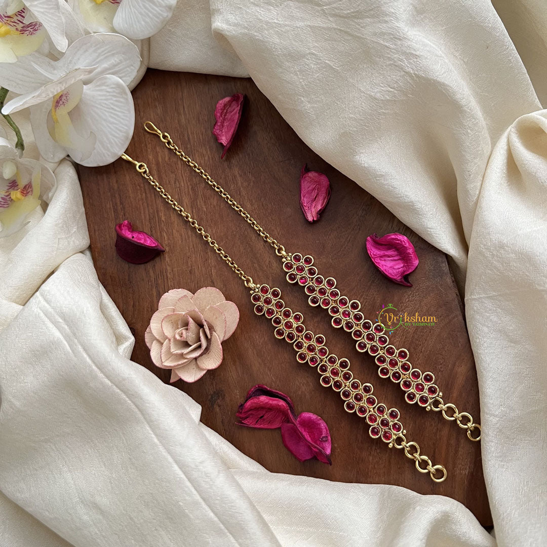 The Vriksham Designer Floral Kemp Style Stone Ear Maatil in red features elegantly crafted floral motifs set with vibrant Kemp stones. This refined piece blends traditional artistry with contemporary sophistication, making it an ideal accessory to enhance your ethnic wear with subtle charm and timeless grace.