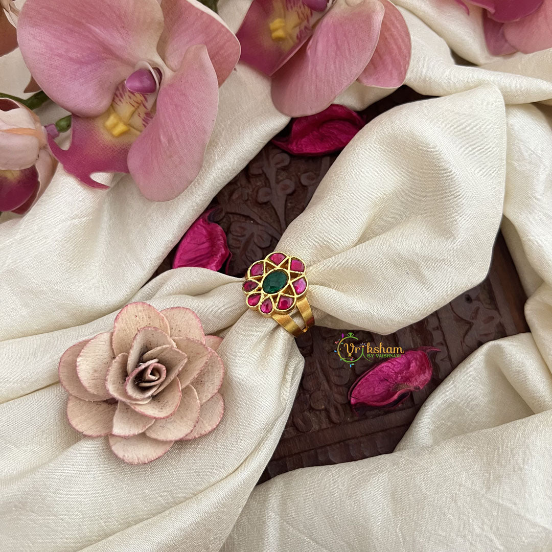 The Vriksham Designer Floral Kundan Jadau Adjustable Finger Ring in red and green features an exquisite floral motif crafted with precision. Its adjustable design ensures a comfortable fit, while the vibrant stones and detailed Jadau work add a refined and sophisticated touch, perfect for enhancing any elegant look.
