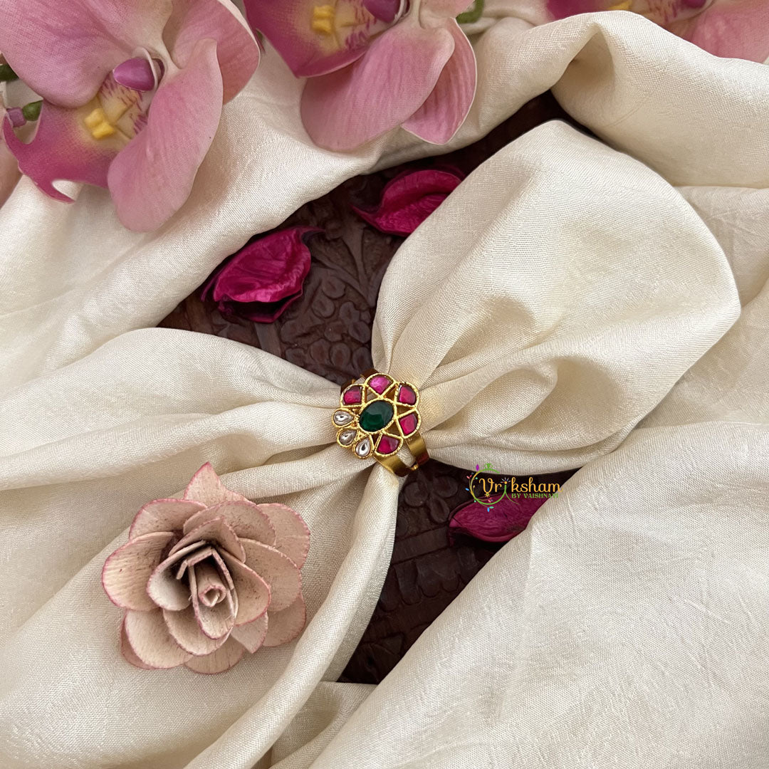 The Vriksham Designer Floral Kundan Jadau Adjustable Finger Ring showcases a refined floral design adorned with red, green, and white stones. Expertly crafted with intricate detailing, this adjustable ring offers both comfort and elegance, making it a sophisticated accessory for any distinguished occasion.