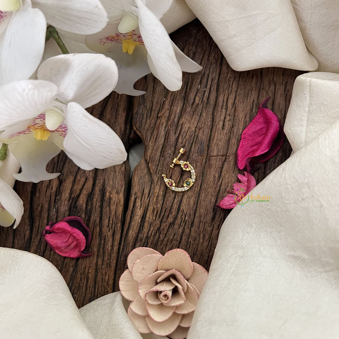 The Vriksham Designer Floral Naths features an exquisite blend of red, white, and green hues arranged in a delicate floral pattern. This finely crafted nose pin combines traditional motifs with elegant design, offering a sophisticated accessory that adds a graceful and vibrant touch to any ensemble.