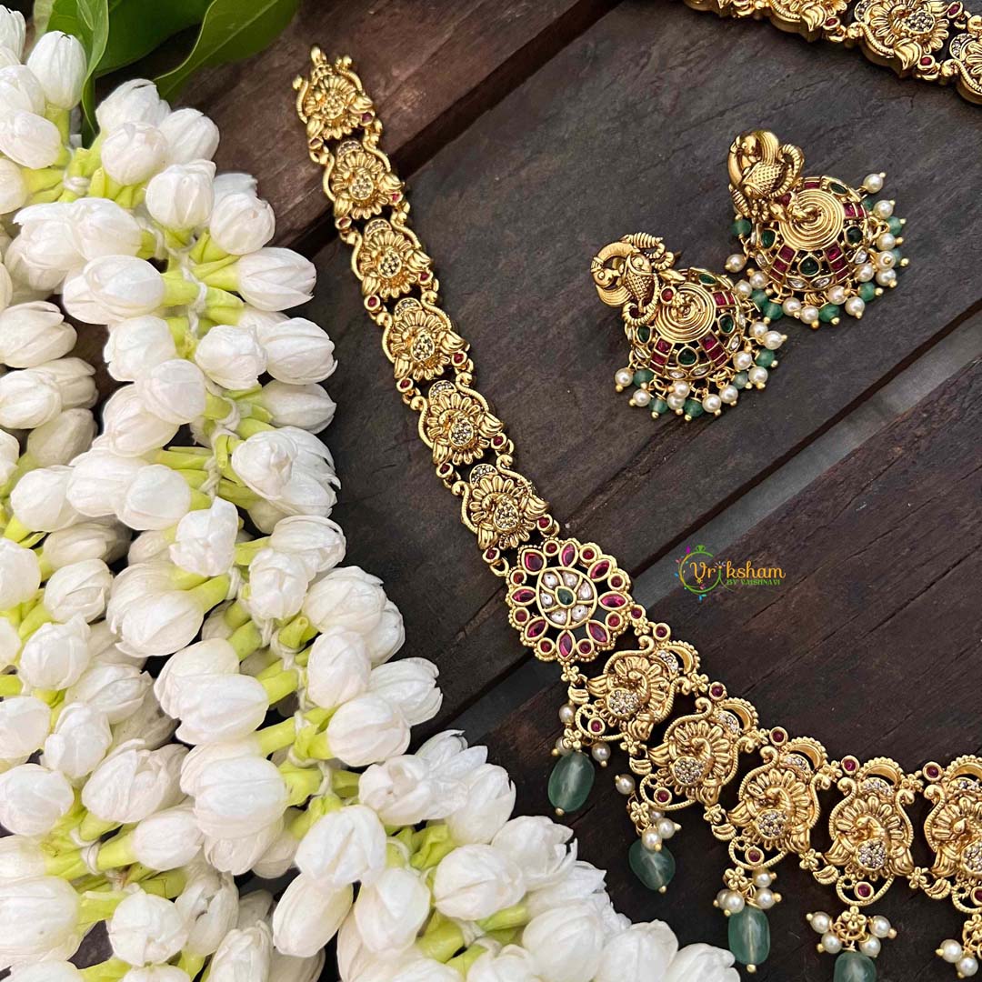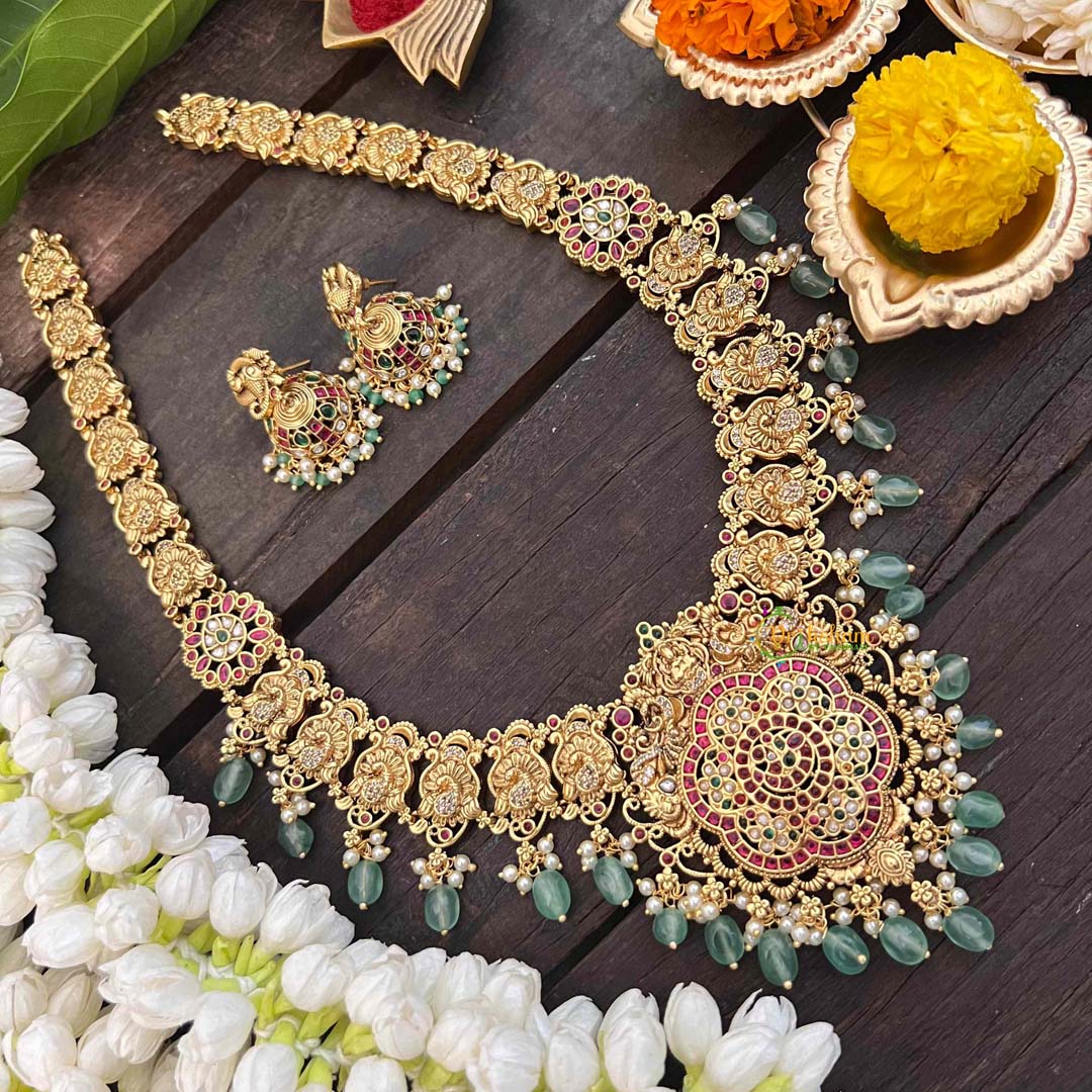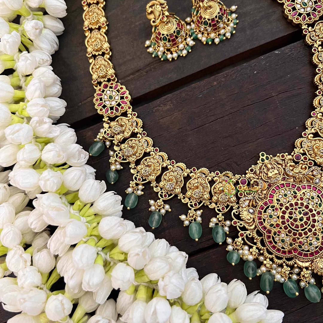 Elevate your style with our Designer Floral Pendant Haram. The aqua green bead and pearl accents add a touch of sophistication and luxury to this exquisite piece. A must-have for any fashion-forward individual. Make a statement with this exclusive haram necklace.