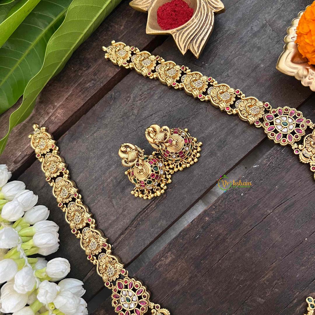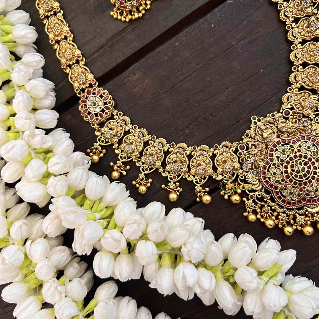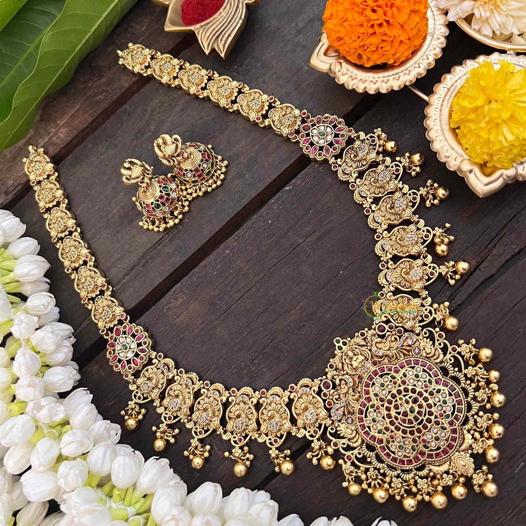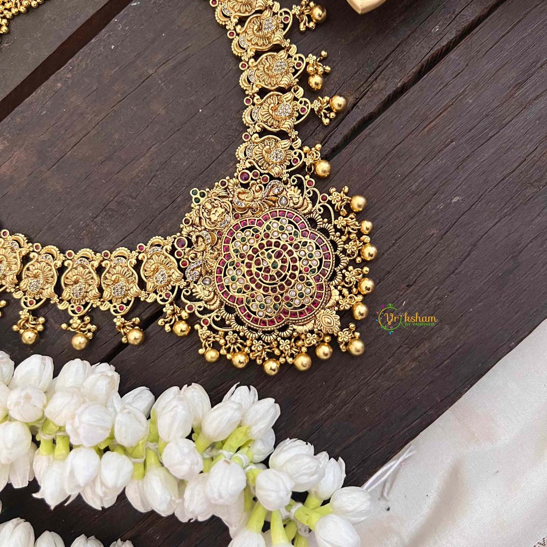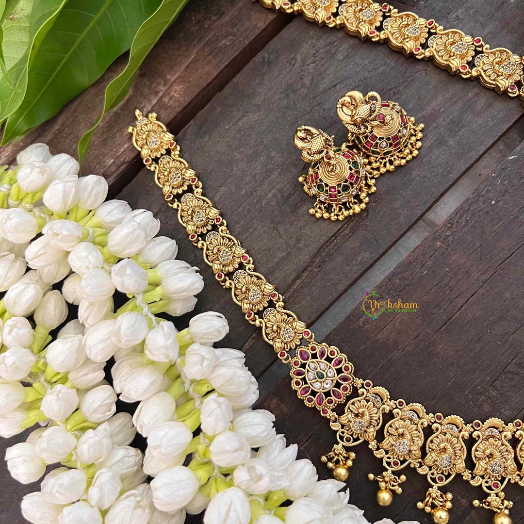 Elevate any look with our Designer Floral Pendant Haram. Made with delicate gold beads, this piece exudes sophistication and luxury. The intricate floral pendant adds a touch of elegance to any outfit. Make a statement with this exclusive and timeless piece.