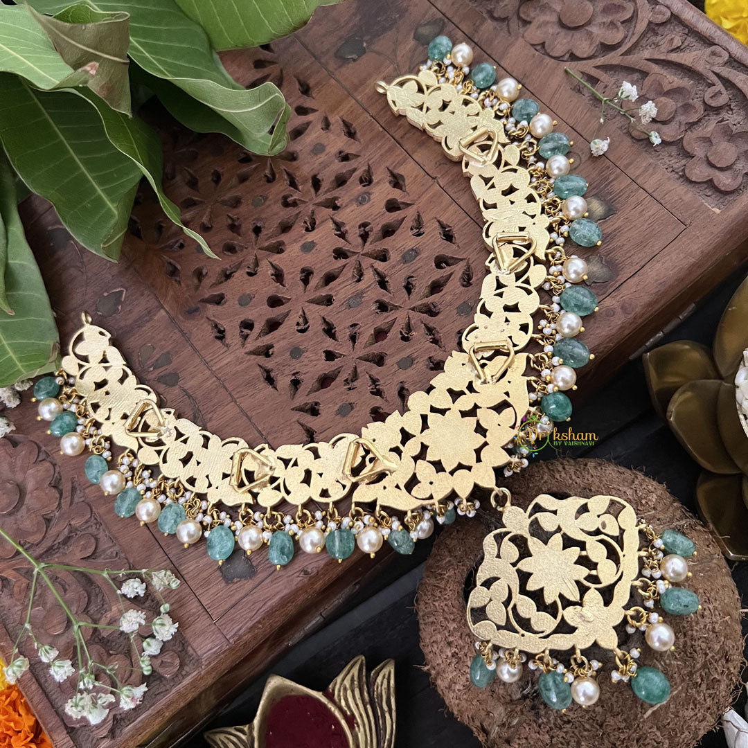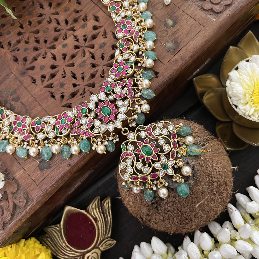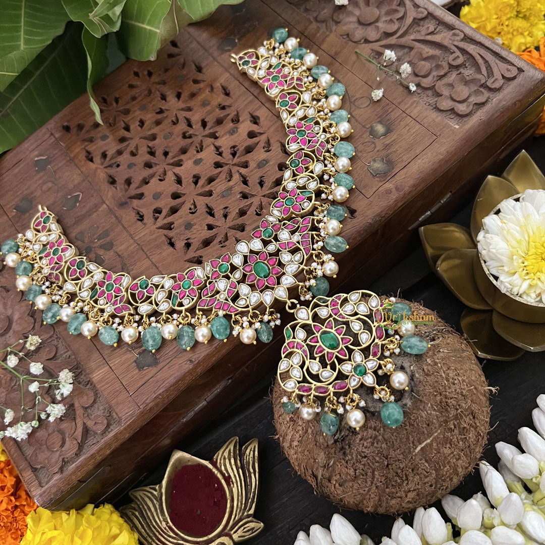 The Vriksham Designer Floral Style Neckpiece showcases exquisite kundan jadau artistry, enhanced by soothing aqua green beads. This sophisticated piece captures the delicate beauty of floral motifs, offering a refined accessory that complements elegant attire for memorable occasions.