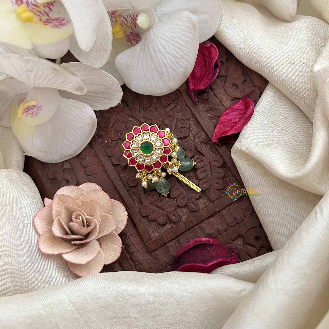 The Vriksham Designer Floral Type Kundan Jadau Jada Billai presents an artful floral pattern adorned with red, white, and green stones, complemented by an aqua green bead. This elegant accessory brings a refined touch to traditional hairstyles, perfect for enhancing your look during weddings and special celebrations with its exquisite design and craftsmanship.