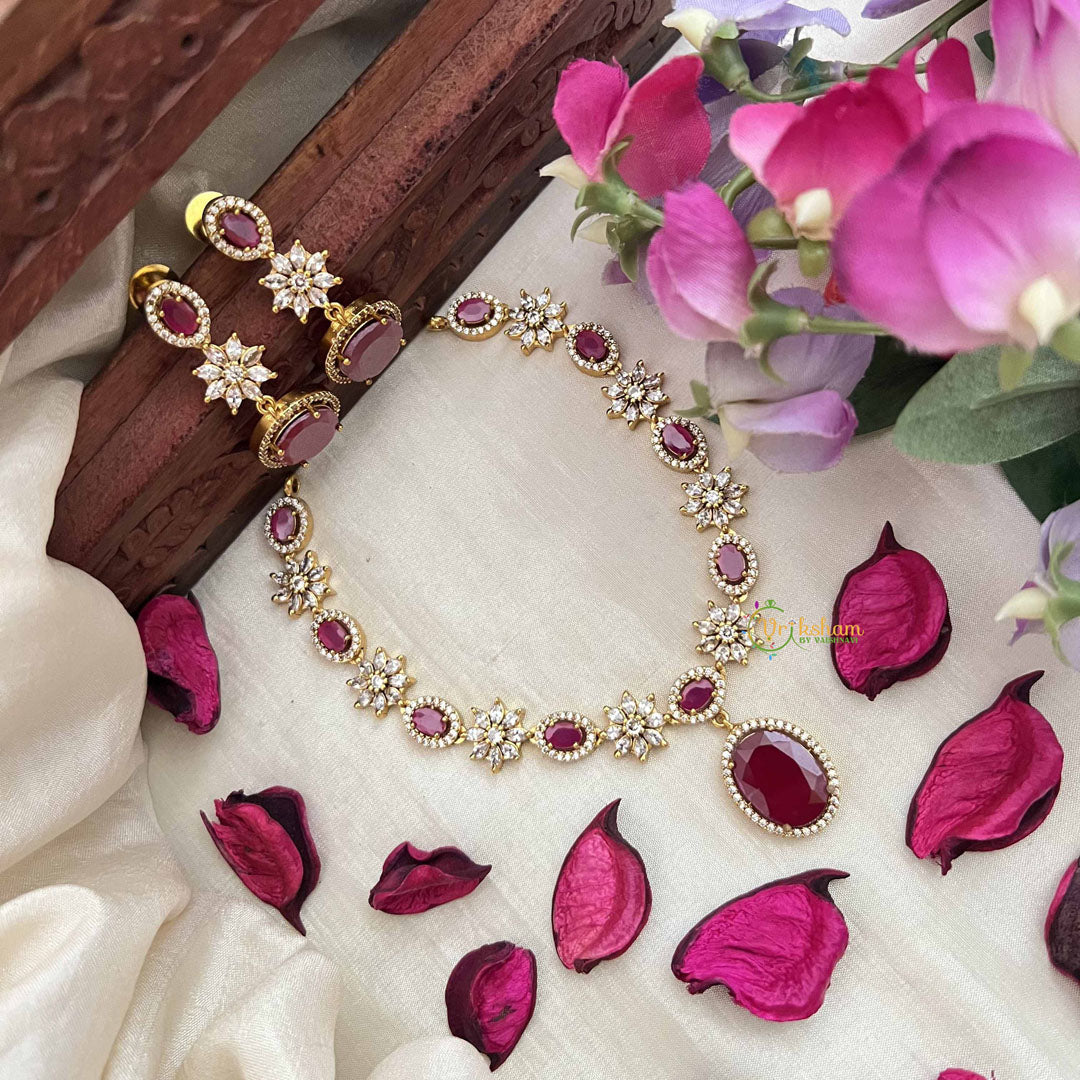 The Vriksham Designer Floral With Pear AD Stone Neckpiece in red features a stunning floral pattern enhanced with pear-shaped AD stones. This sophisticated accessory blends detailed craftsmanship with a vibrant hue, offering a graceful and elegant touch to complement your formal attire.