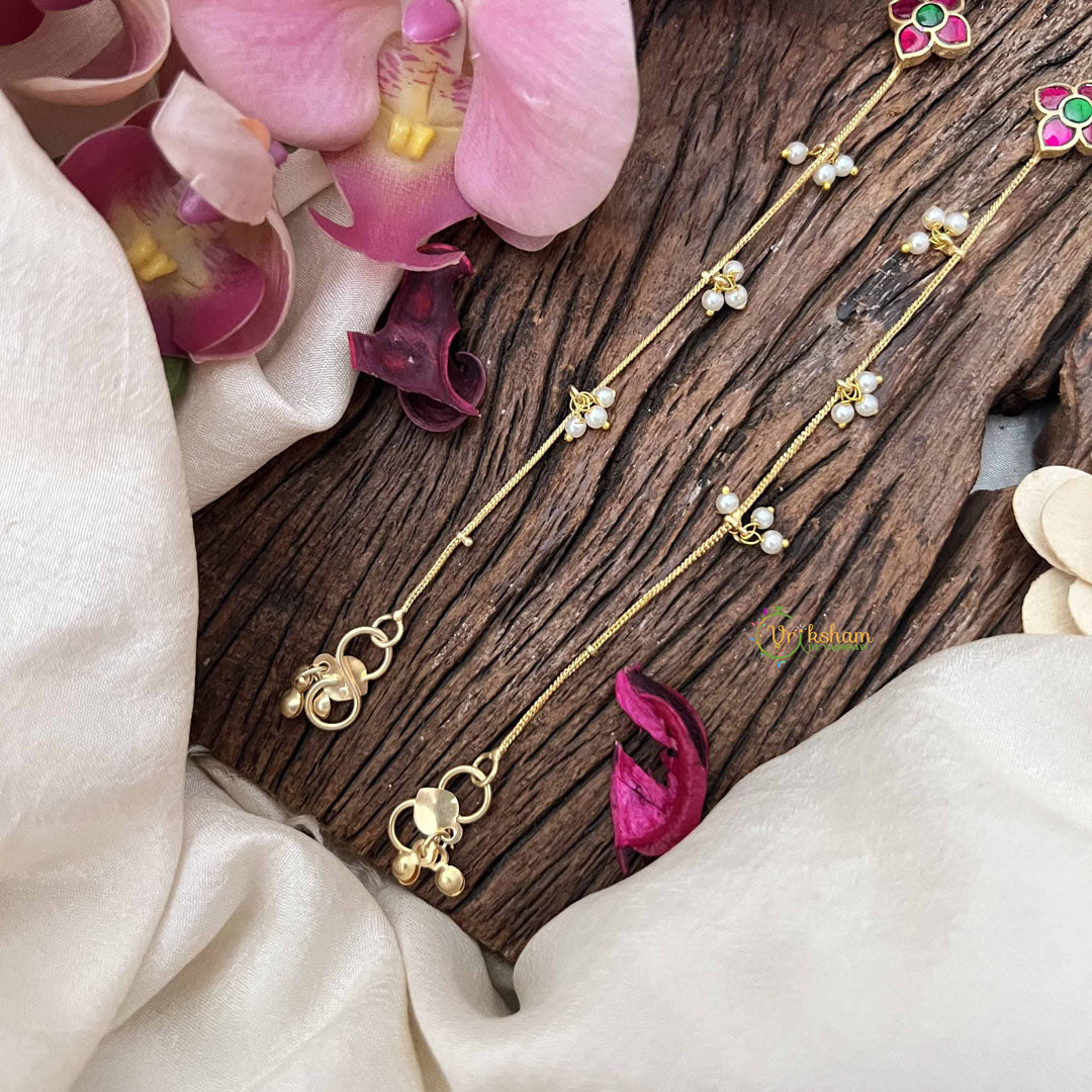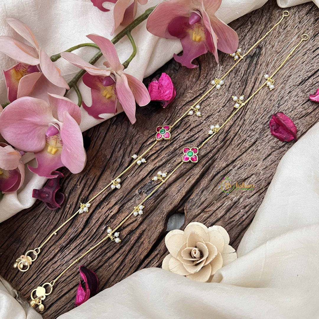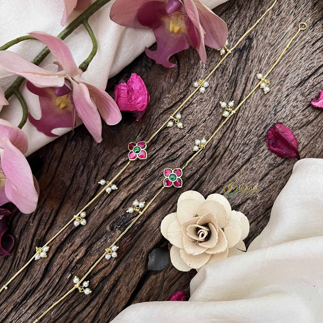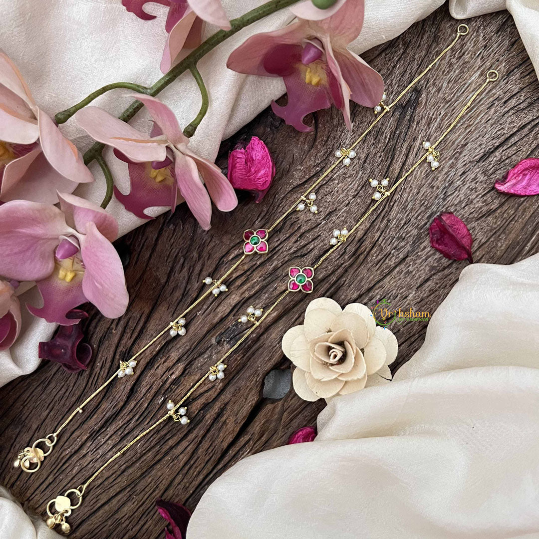 Experience elegant artistry with Vriksham’s Designer Floral With Pearls Drop Line Gold Look Alike Anklets in Red and Green. Featuring intricate floral motifs accented by delicate pearls, these anklets offer a luxurious gold-inspired finish with vibrant color details. Perfect for adding a sophisticated and unique touch to your traditional or contemporary outfits.