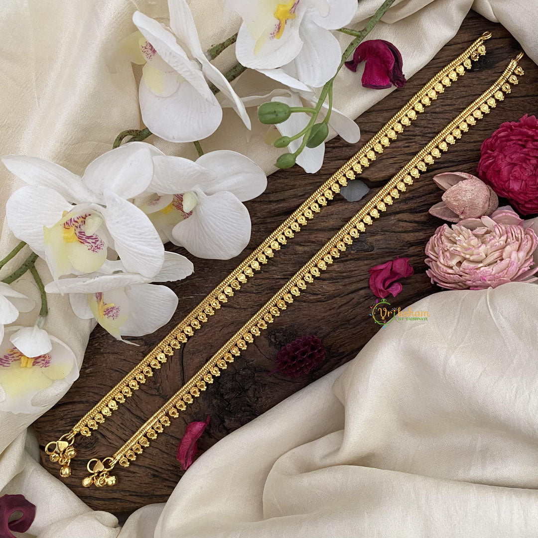 Indulge in a touch of luxury with our Vriksham Designer Gold Look Alike Bridal Anklets. The intricate design exudes sophistication and exclusivity, elevating any outfit with its elegant charm. Crafted to perfection, these anklets are the perfect addition to your collection.