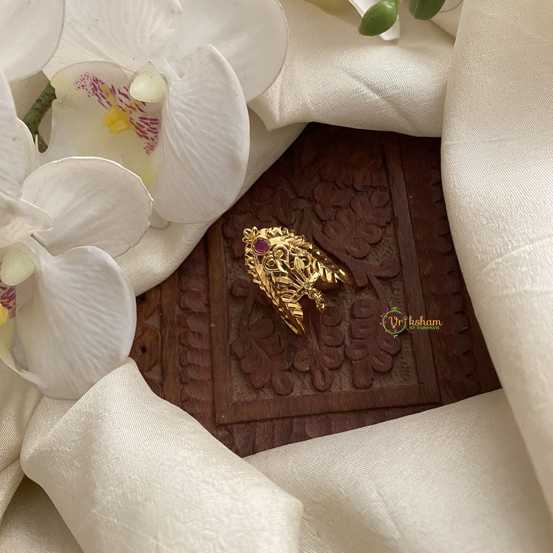 Strike a pose with the Vriksham Designer Gold Look Alike Vangi Ring in red. This stunning piece features intricate design details and a luxurious gold finish that will elevate any outfit. Get the look of gold without the cost, and make a statement with this exclusive ring.