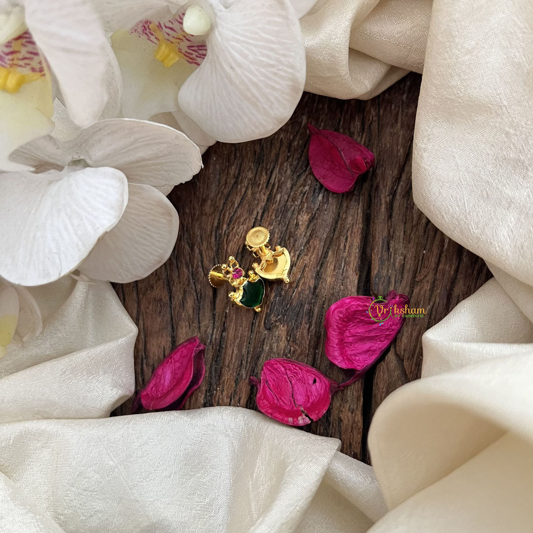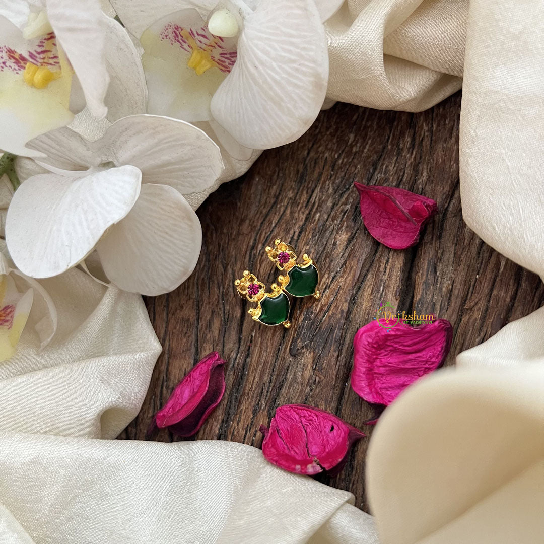 Discover the timeless allure of the Vriksham Designer Gold Plated Kerala Palakka Stud Earrings. Featuring a delicate combination of green and pink tones, these earrings are crafted with meticulous attention to detail and a luxurious gold-plated finish. Perfectly suited for sophisticated occasions, they add a graceful touch of tradition and elegance to any ensemble.