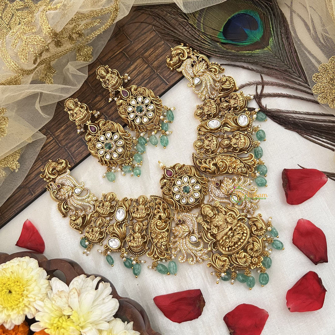 The Vriksham Designer Gold Plated Lakshmi Neckpiece features elegant green beads accentuating a beautifully crafted Lakshmi design. This sophisticated piece combines traditional motifs with fine gold plating, offering a timeless accessory that enhances your festive or formal attire with grace and refined charm.
