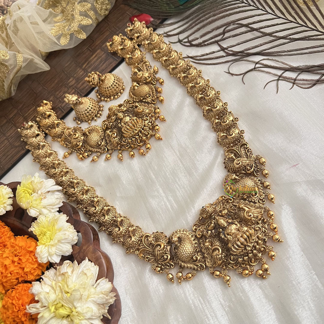 Elevate your bridal ensemble with the Vriksham Designer Gold Plated Lakshmi With Peacock Bridal Set. Featuring intricate gold beadwork and a stunning Lakshmi motif paired with elegant peacock designs, this set blends traditional artistry with refined craftsmanship. Perfect for special occasions, it adds a touch of timeless sophistication and cultural richness to your look.