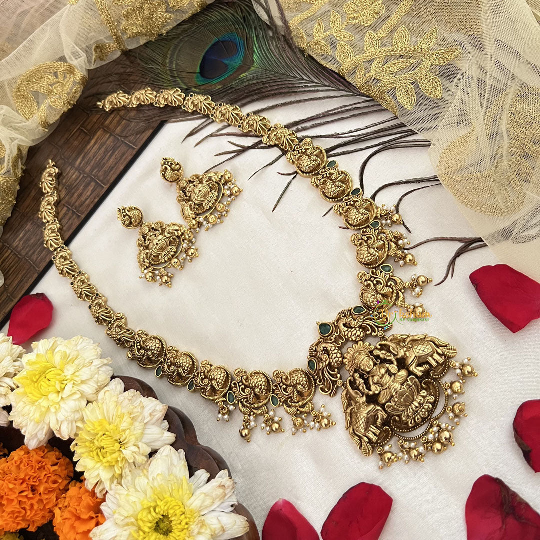 The Vriksham Designer Gold Plated Lakshmi Pendant features an intricate peacock motif, beautifully crafted and complemented by a long neckpiece adorned with gold beads. This sophisticated design blends traditional symbolism with elegant detailing, making it a perfect statement piece for special occasions.