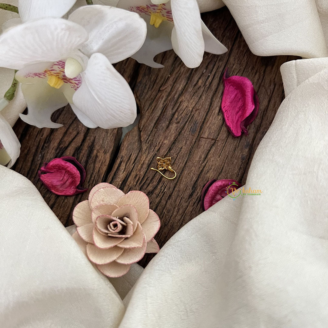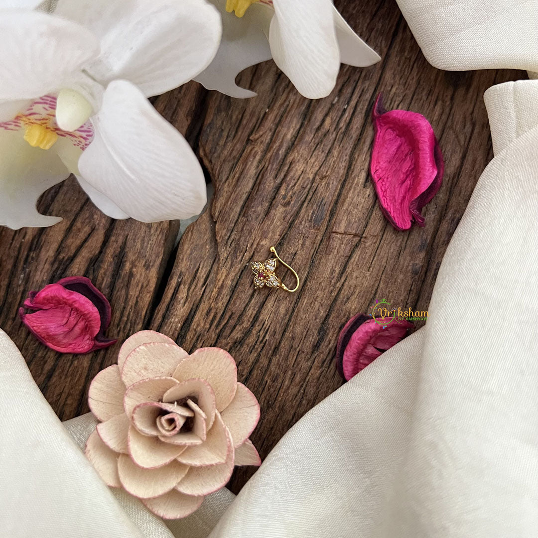 The Vriksham Designer Golden Naths in red and white features elegant craftsmanship with a delicate interplay of colors set in a rich golden finish. This sophisticated nose pin adds a timeless and graceful touch to traditional ensembles, perfect for elevating your look with understated elegance.