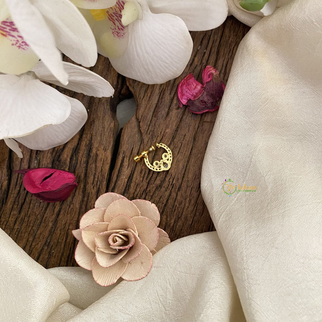 Elevate your beauty with the Vriksham Designer Golden Naths/Nose pin-White. Enhanced with delicate craftsmanship, this luxurious accessory adds a touch of elegance to any look. Made with premium materials, it is perfect for any occasion and exudes an air of sophistication. Elevate your style and embrace the world of luxury with Vriksham.