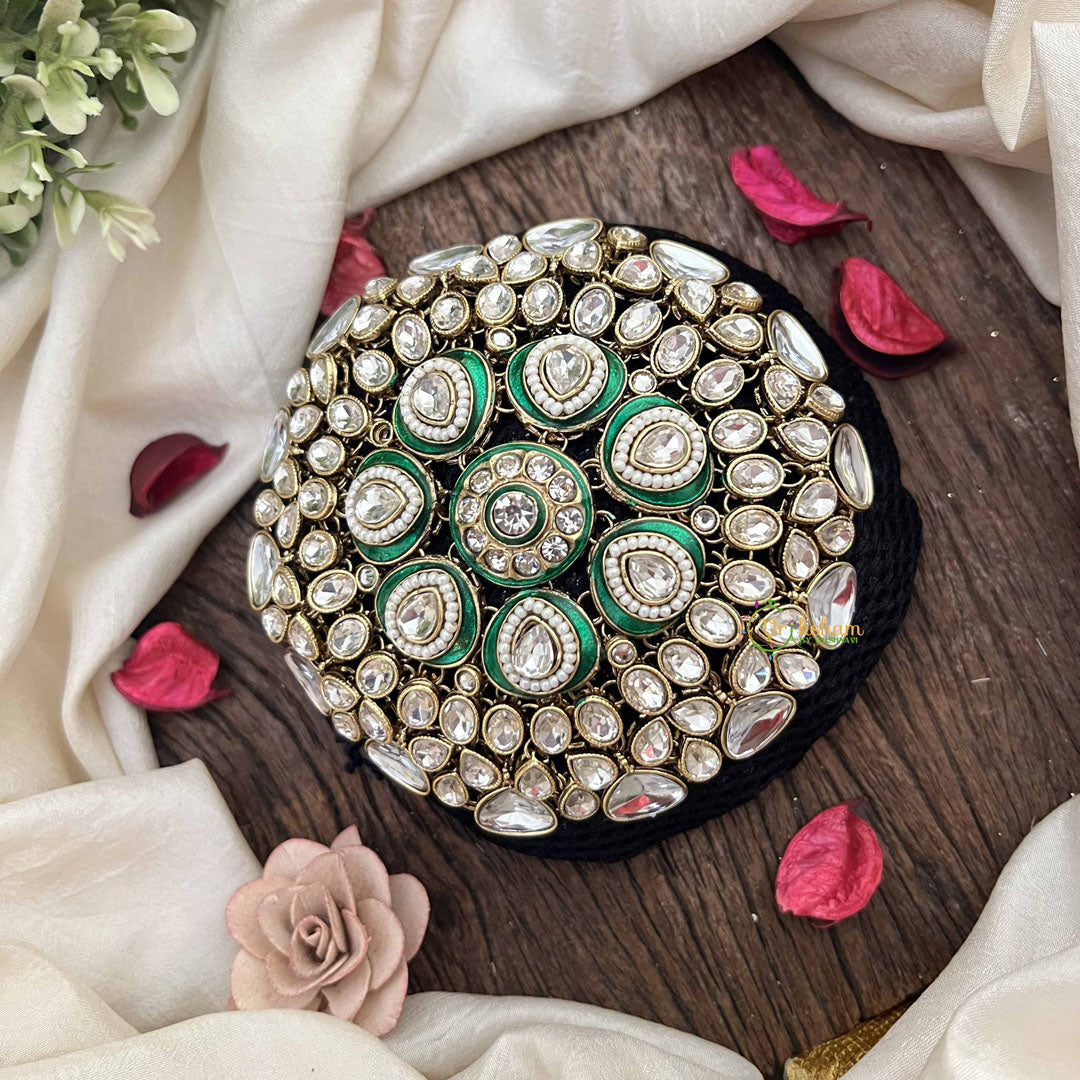The Vriksham Designer Green Coated Pear Crystal Design Gold Tone Hair Bun Cage Accessory features a striking fusion of green-coated pear-shaped crystals set against a warm gold tone. This elegant piece enhances your hairstyle with refined color and sparkle, providing a sophisticated and unique finishing touch for special occasions and bridal ensembles.