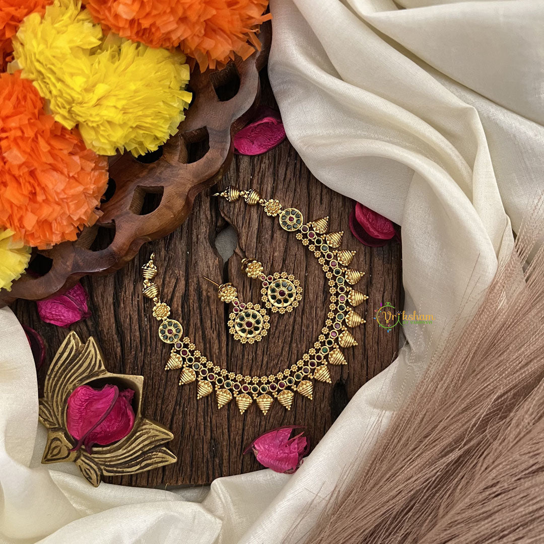 Elevate your style with the Vriksham Designer Green Red Stone Short Neckpiece. This stunning piece features vibrant green red stones, crafted with exquisite detailing. Perfect for adding a touch of luxury to any outfit. Elevate your look with this exclusive accessory.