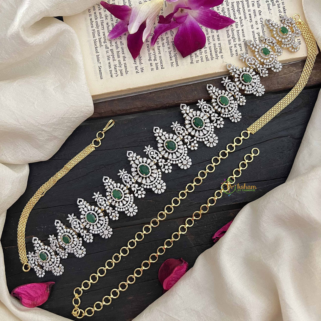 Elevate your traditional ensemble with the Vriksham Designer Green Hipchain, adorned with intricate floral motifs and shimmering AD stones. This exquisite piece blends artistry and elegance, enhancing your waistline with subtle sparkle and refined craftsmanship. Perfect for special occasions, it adds a sophisticated touch to your ethnic attire.