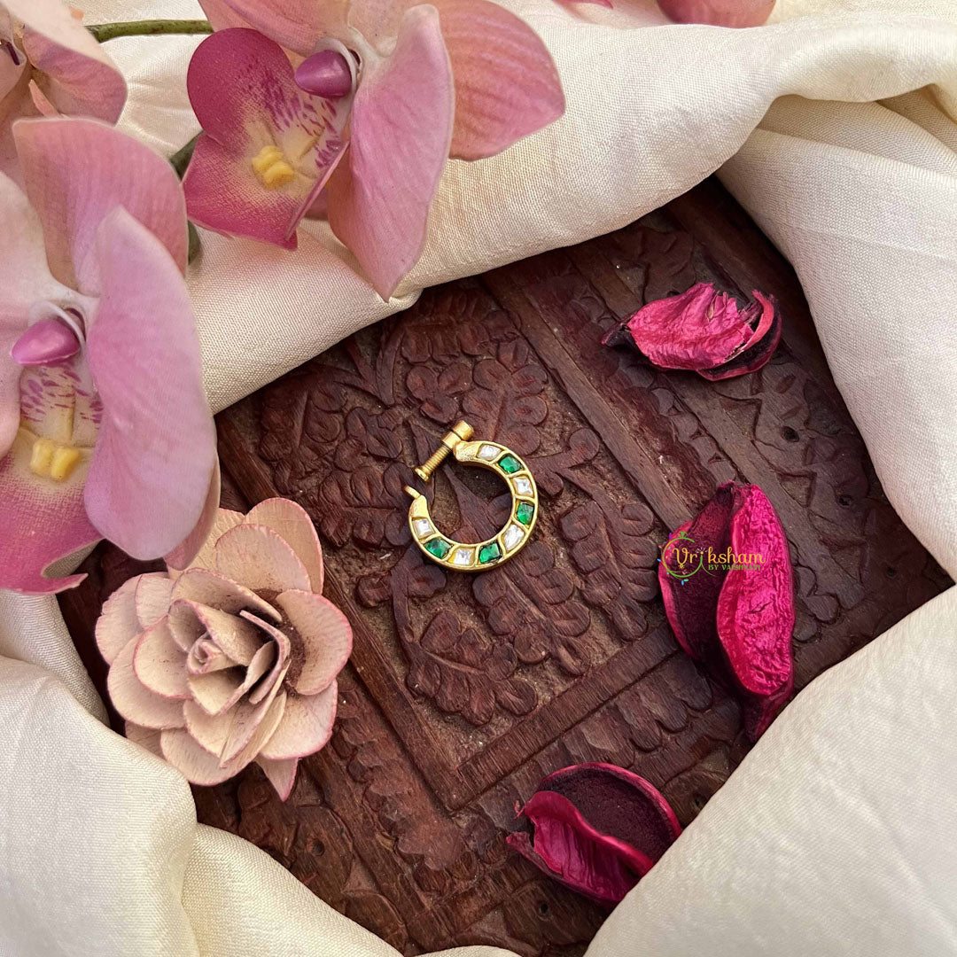 The Vriksham Designer Half Moon Nath features an elegant blend of green and white stones set in intricate Jadau craftsmanship. Its refined half-moon design and secure press-fit offer both sophistication and comfort, making it a graceful addition to your traditional jewelry collection.