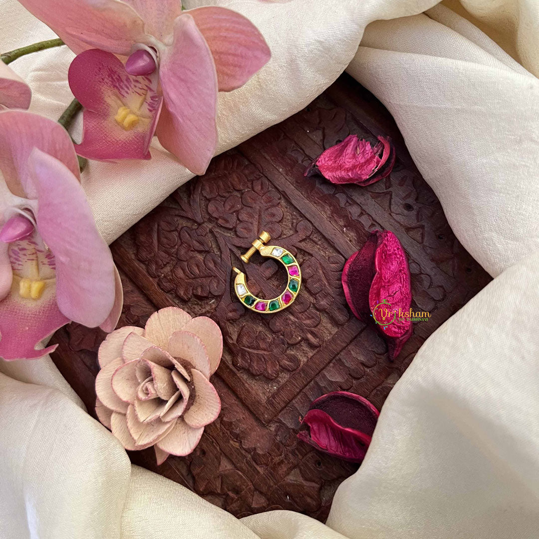 The Vriksham Designer Half Moon Nath showcases a sophisticated blend of green, white, and red stones, expertly set in detailed Jadau craftsmanship. Its elegant half-moon shape with a secure press-fit combines traditional artistry with comfortable wear, making it a distinguished accessory for your ethnic ensemble.