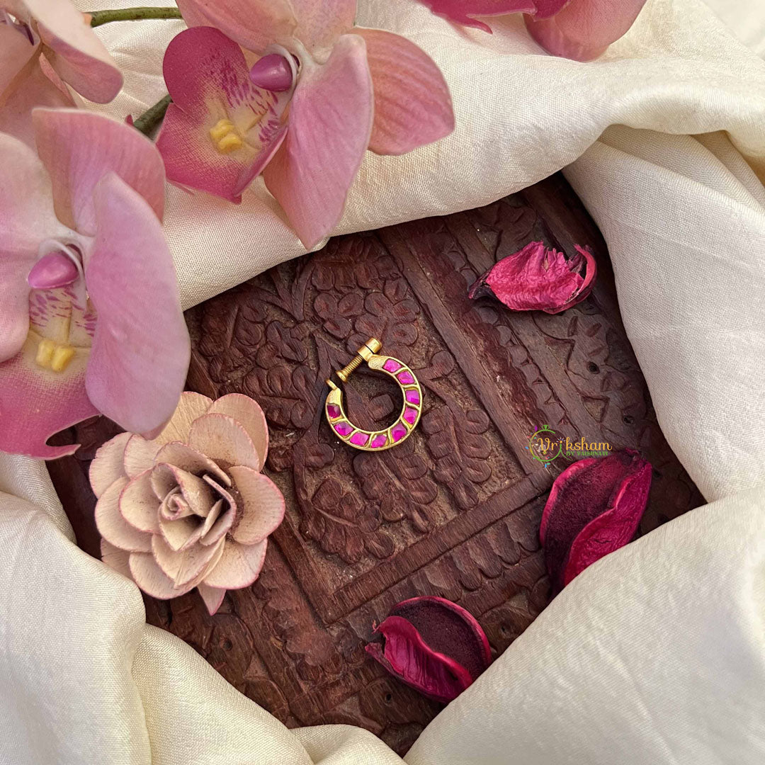 The Vriksham Designer Half Moon Nath showcases intricate Jadau craftsmanship accented with vibrant red stones. Its elegant half-moon design and secure press-fit combine to offer a sophisticated and comfortable accessory, perfect for adding a refined touch to your traditional ensemble.