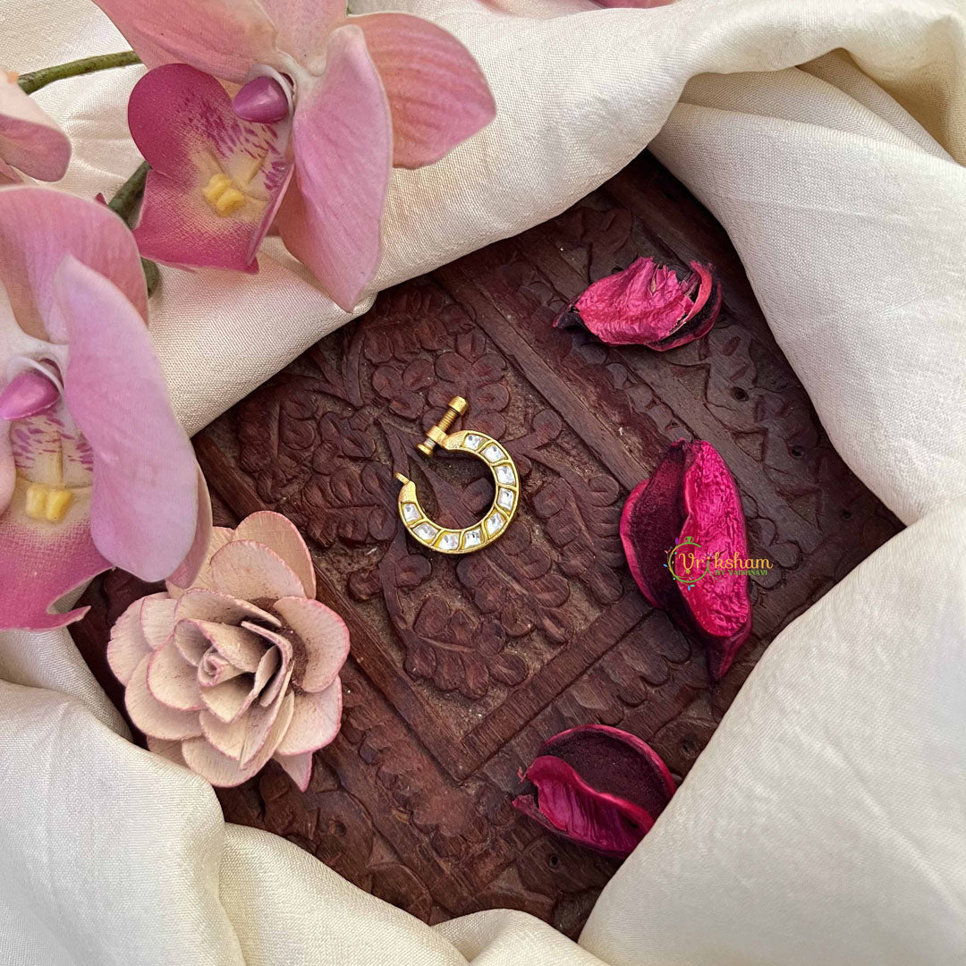 Elevate your traditional look with the Vriksham Designer Half Moon Jadau Press Nose Pin in White. Crafted with meticulous detail, this elegant half-moon design embodies refined artistry and timeless charm. Its delicate craftsmanship ensures a comfortable fit while adding a subtle yet striking accent to your ensemble. Perfect for enhancing both everyday and festive styles with a touch of sophistication.