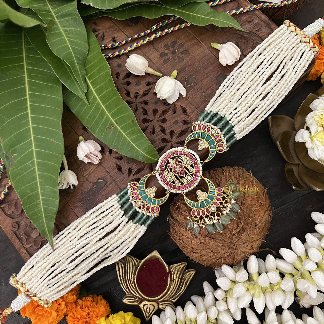 The Vriksham Designer Half Moon Style Kundan Jadau Choker, adorned with vibrant firosa-colored beads, offers a perfect blend of traditional artistry and contemporary elegance. Its unique half-moon design and intricate Kundan detailing make it a striking statement piece, ideal for adding a sophisticated touch to your ensemble.