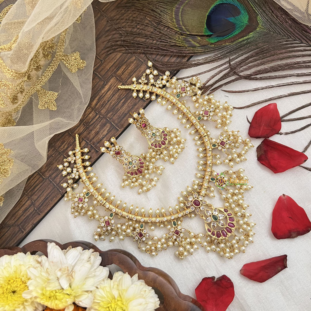 The Vriksham Designer Lotus Style with Diya Shape Short Neckpiece features delicate pearls accentuating an elegant lotus and diya motif. This sophisticated piece blends traditional symbolism with refined craftsmanship, making it a graceful accessory to enhance your festive or formal attire with timeless beauty.