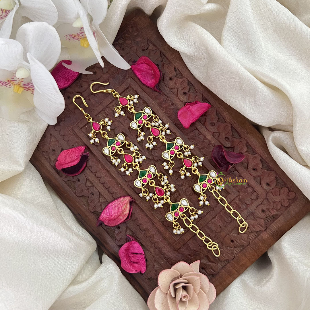 Elevate your elegance with the Vriksham Designer Kundan Jadau Single Strand Maatil. Featuring a harmonious blend of red, green, and white pearls, this exquisite piece showcases traditional craftsmanship with a refined modern touch. Perfect for special occasions, it adds a timeless charm and subtle sophistication to any ensemble.