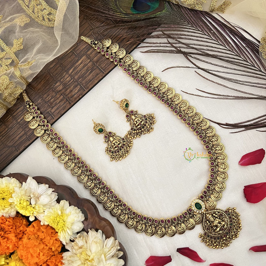 The Vriksham Designer Lakshmi Gold Coin Long Neckpiece showcases a beautifully detailed Lakshmi pendant paired with a traditional gold coin design. This elegant piece combines cultural heritage with refined craftsmanship, offering a sophisticated accessory that symbolizes prosperity and grace. Perfect for enhancing formal attire, it adds a timeless charm to your jewelry collection.