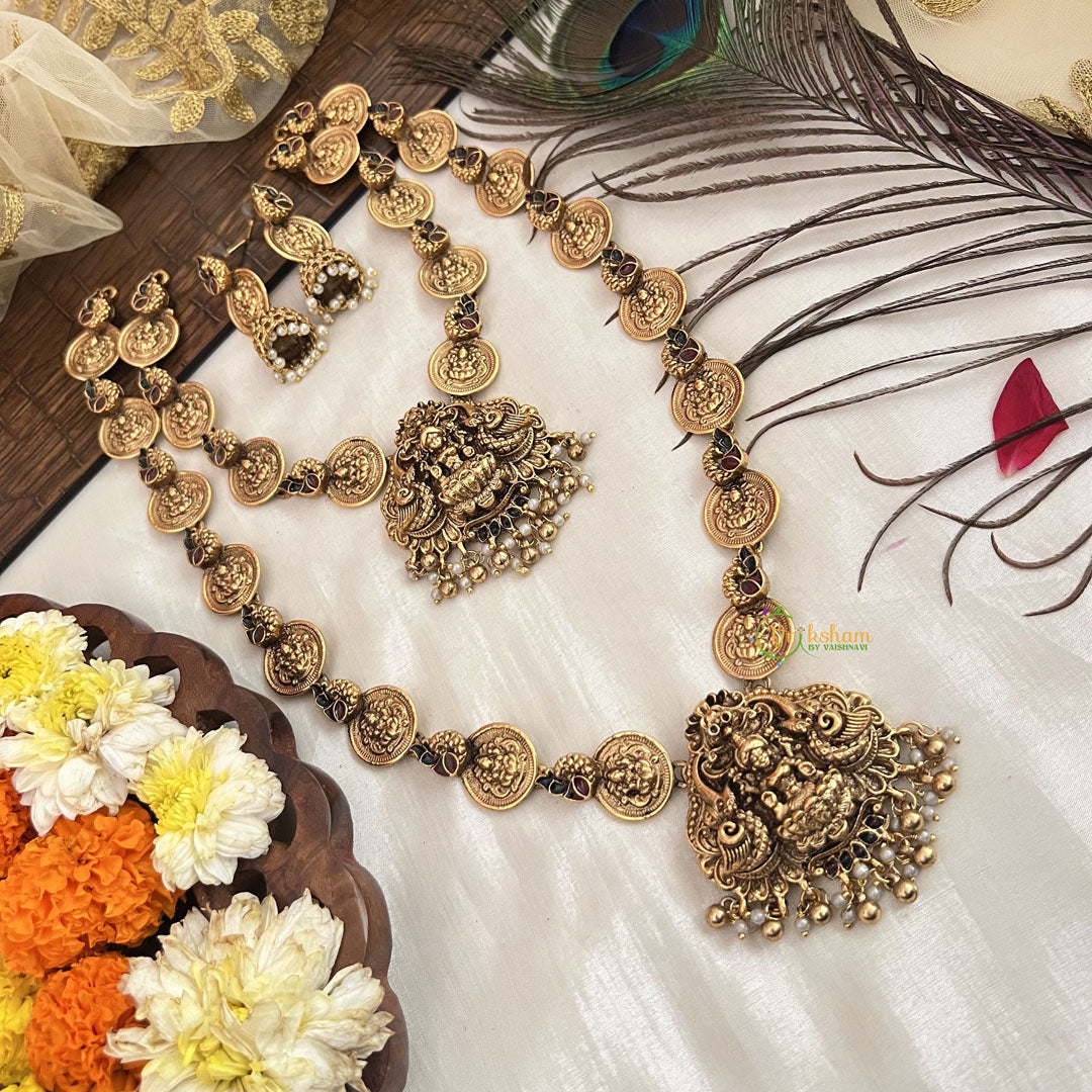 The Vriksham Designer Lakshmi Kasu Mala Bridal Set in Green, Red, and Gold Pearl features intricate Lakshmi kasu motifs paired with vibrant green and red accents. Adorned with shimmering gold pearls, this set exudes timeless elegance and cultural richness, making it an exquisite choice for brides seeking a sophisticated and traditional look on their special day.