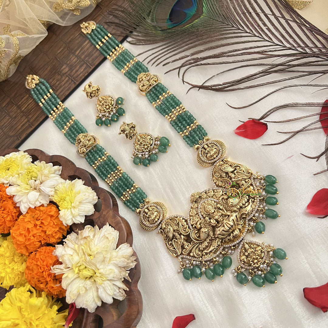 Elevate your elegance with the Vriksham Designer Lakshmi Pendant Green Beaded Long Neckpiece. Featuring a finely crafted Lakshmi pendant paired with vibrant green beads, this necklace blends traditional charm with contemporary style. Its long design adds grace to any outfit, making it perfect for special occasions or refined everyday wear.