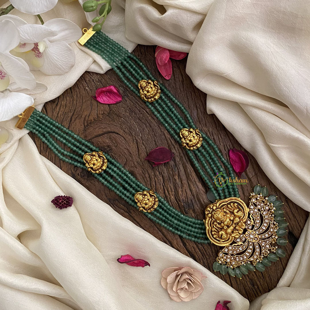Indulge in luxury with our Vriksham Designer Lakshmi Pendant Kundan Jadau Beaded Mala, featuring a delicate pastel green bead. Adorned with exquisite Kundan and Jadau work, this pendant captures the essence of elegance and sophistication. Perfect for adding a touch of glamour to any outfit.