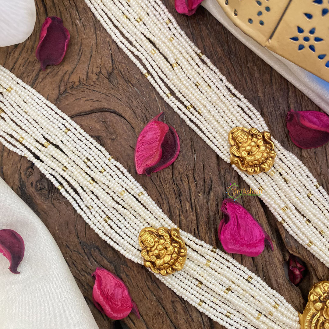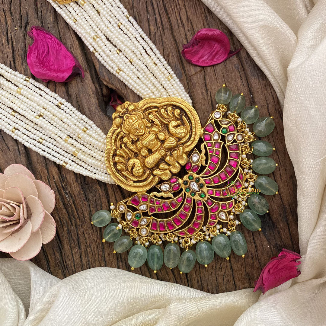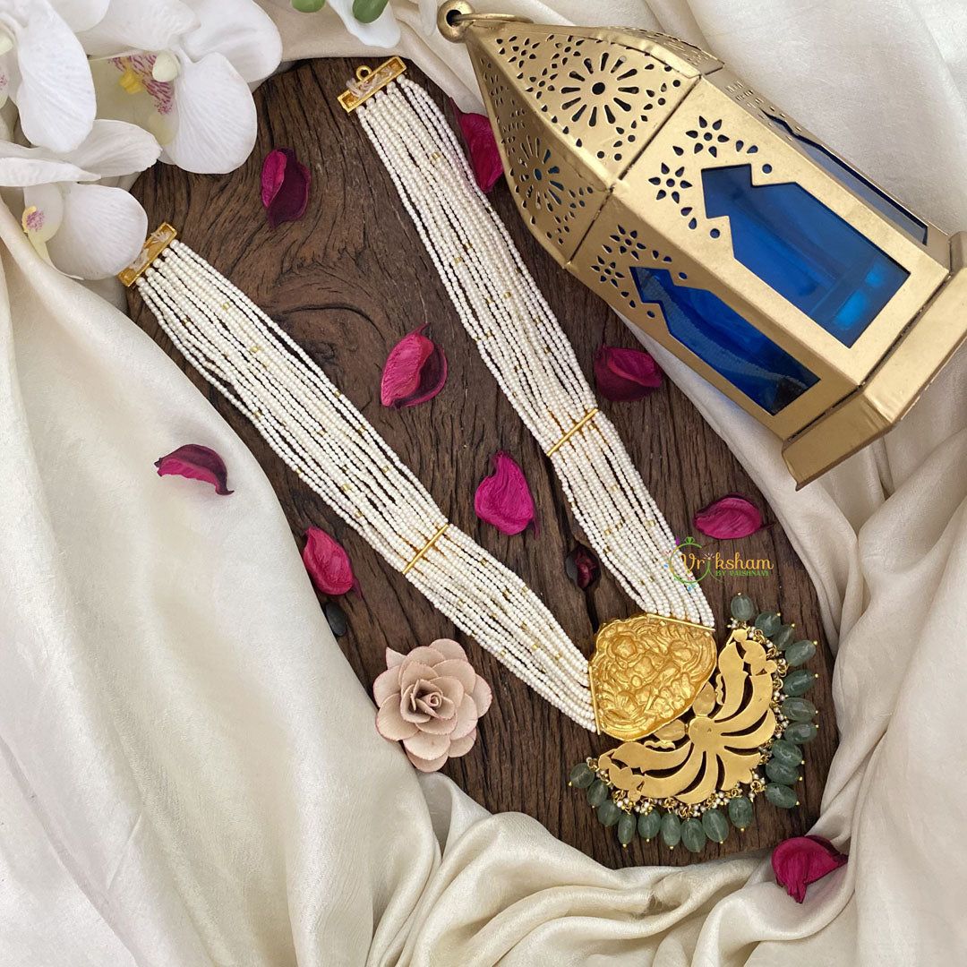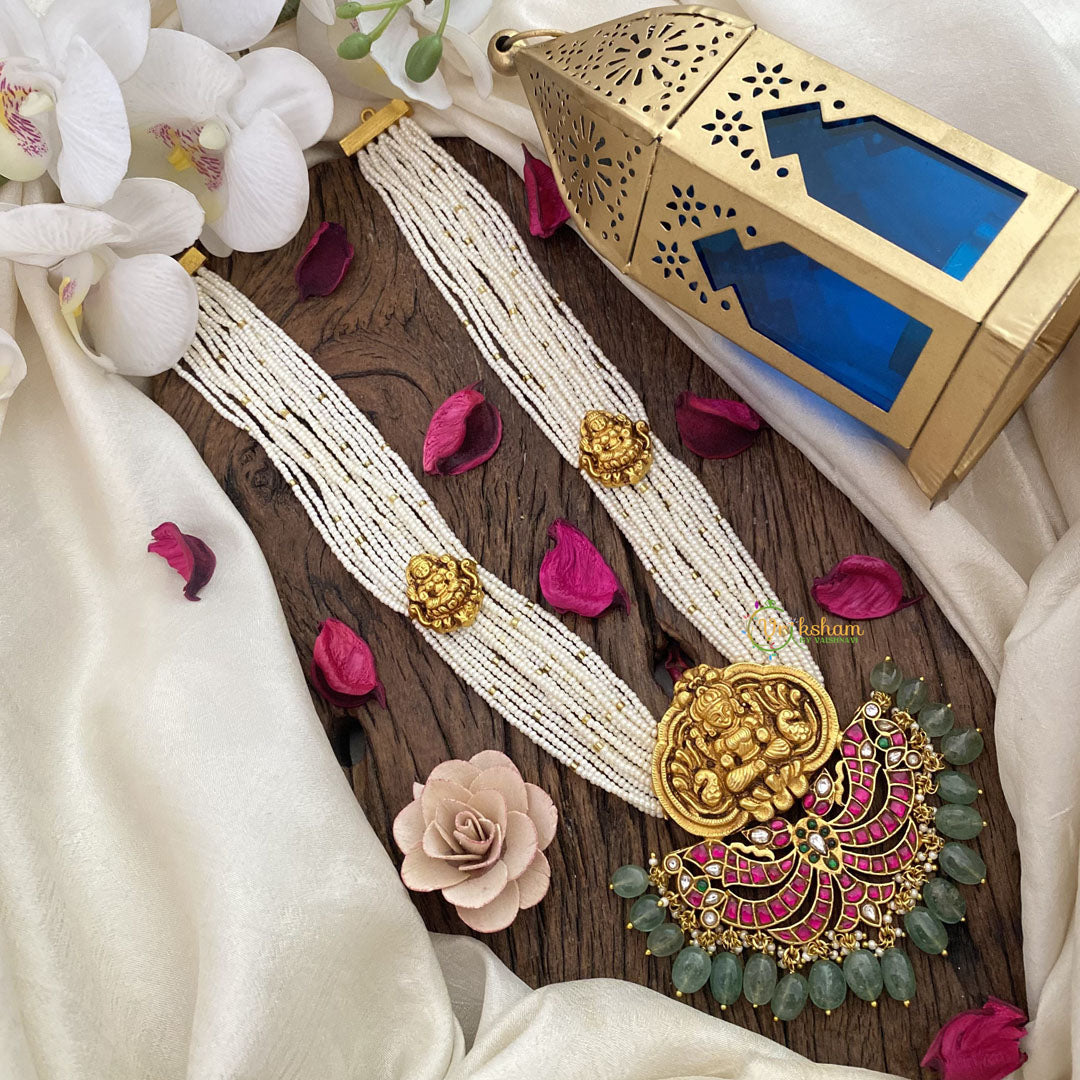 This exquisite Vriksham designer pendant features a delicate Lakshmi design, crafted with intricate Kundan Jadau work and adorned with a string of lustrous white beads, accented by a pastel green bead on the mala. Experience the elegance and opulence of traditional Indian art with this stunning piece.