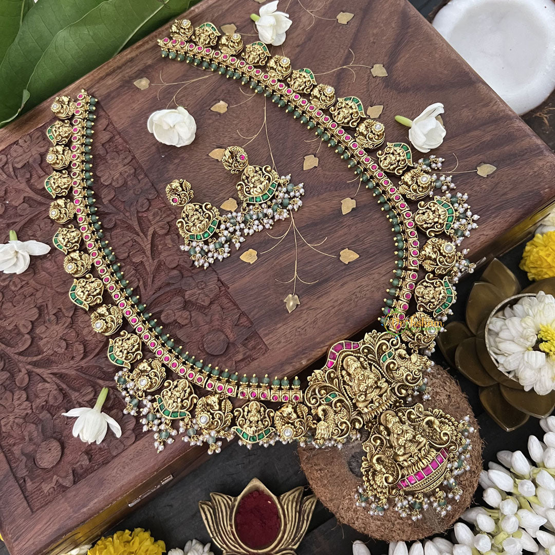 Elevate your elegance with the Vriksham Designer Lakshmi Style Pendant, featuring exquisite Kundan Jadau craftsmanship. This green long Guttapusalu neckpiece is adorned with lustrous pearls, blending traditional artistry with refined sophistication. Perfect for special occasions, it adds a timeless charm to your ensemble.
