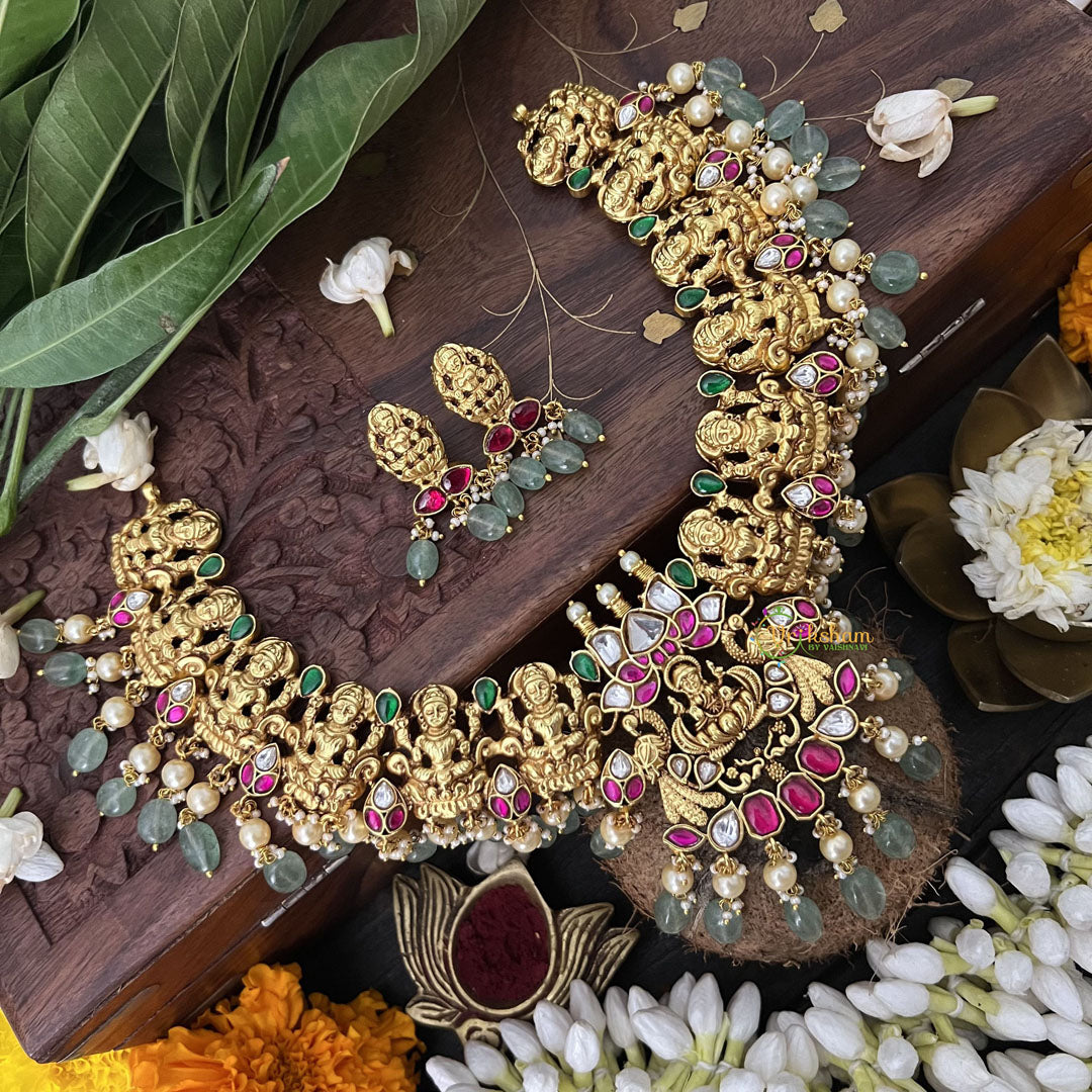 The Vriksham Designer Lakshmi Style Pendant Kundan Jadau Neckpiece features a refined blend of green and aqua green beads, highlighting the intricate Lakshmi motif. This sophisticated piece showcases expert craftsmanship and adds a graceful, cultural elegance to your ensemble, perfect for elevating special occasion looks.