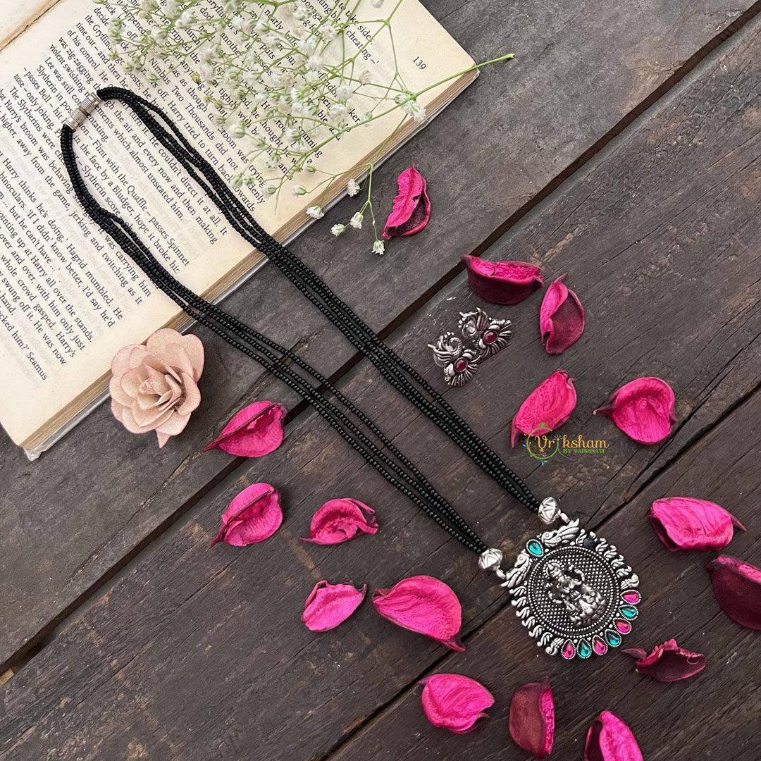 The Vriksham Designer Lakshmi Style Silver Oxidized Pendant Magalsutra features an intricately designed Lakshmi pendant in oxidized silver, paired gracefully with black beads. This sophisticated piece elegantly blends traditional symbolism with contemporary design, making it an exquisite accessory for any refined occasion.