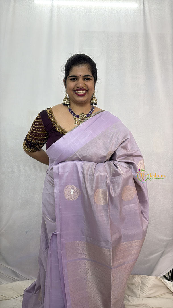 The Vriksham Designer Lavender with Silver Work Pure Soft Silk Saree blends soft lavender hues with intricate silver embroidery. Crafted from pure soft silk, this saree offers a smooth, luxurious drape and a sophisticated shimmer, making it perfect for elegant occasions demanding subtle yet striking style.