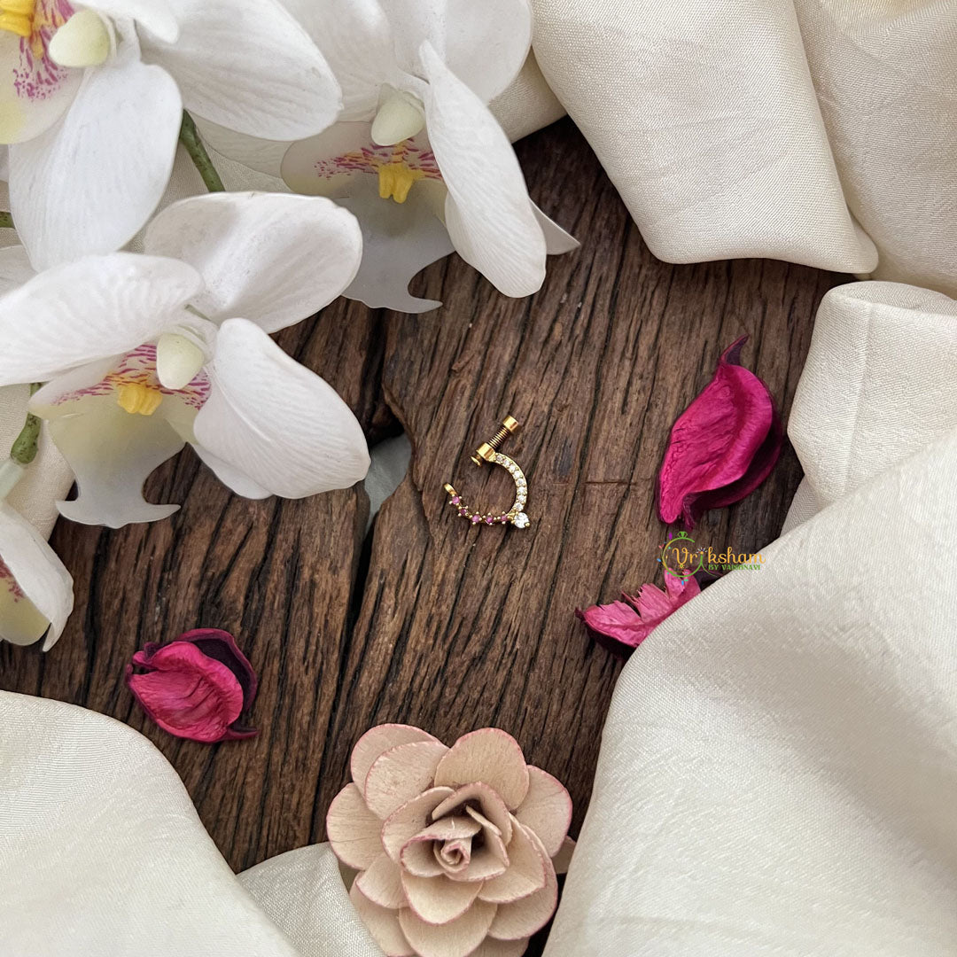 The Vriksham Designer Leaf Naths/Nose Pin in red and white features an elegant leaf-inspired design, blending traditional motifs with refined craftsmanship. This sophisticated accessory adds a graceful touch to your look, perfect for enhancing both bridal and festive attire.