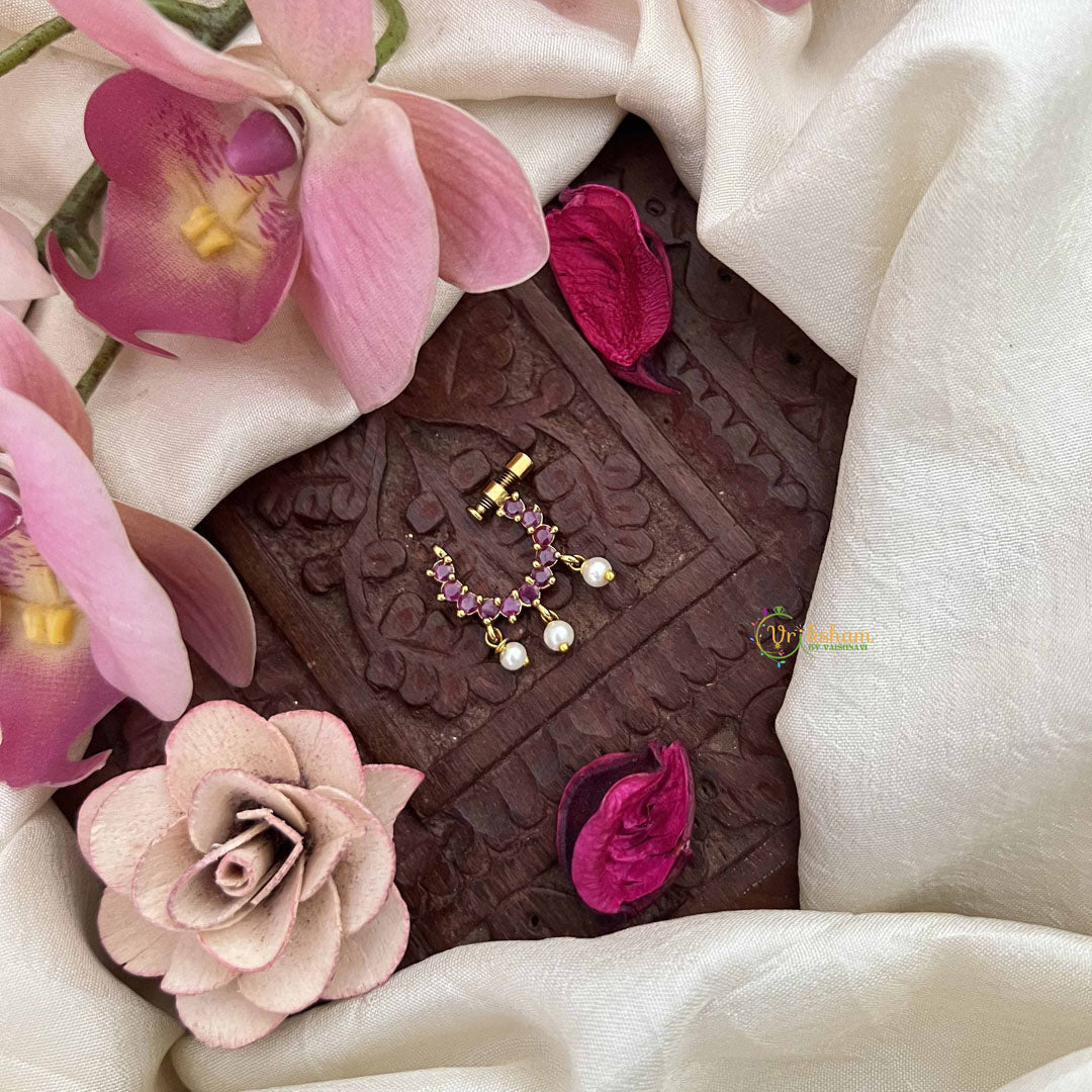 The Vriksham Designer Leaf Style Press Naths in red, embellished with delicate pearls, offers a sophisticated take on a classic motif. Its secure press-fit ensures comfortable wear, while the intricate design adds a graceful and refined accent, perfect for elevating both traditional and contemporary ensembles.