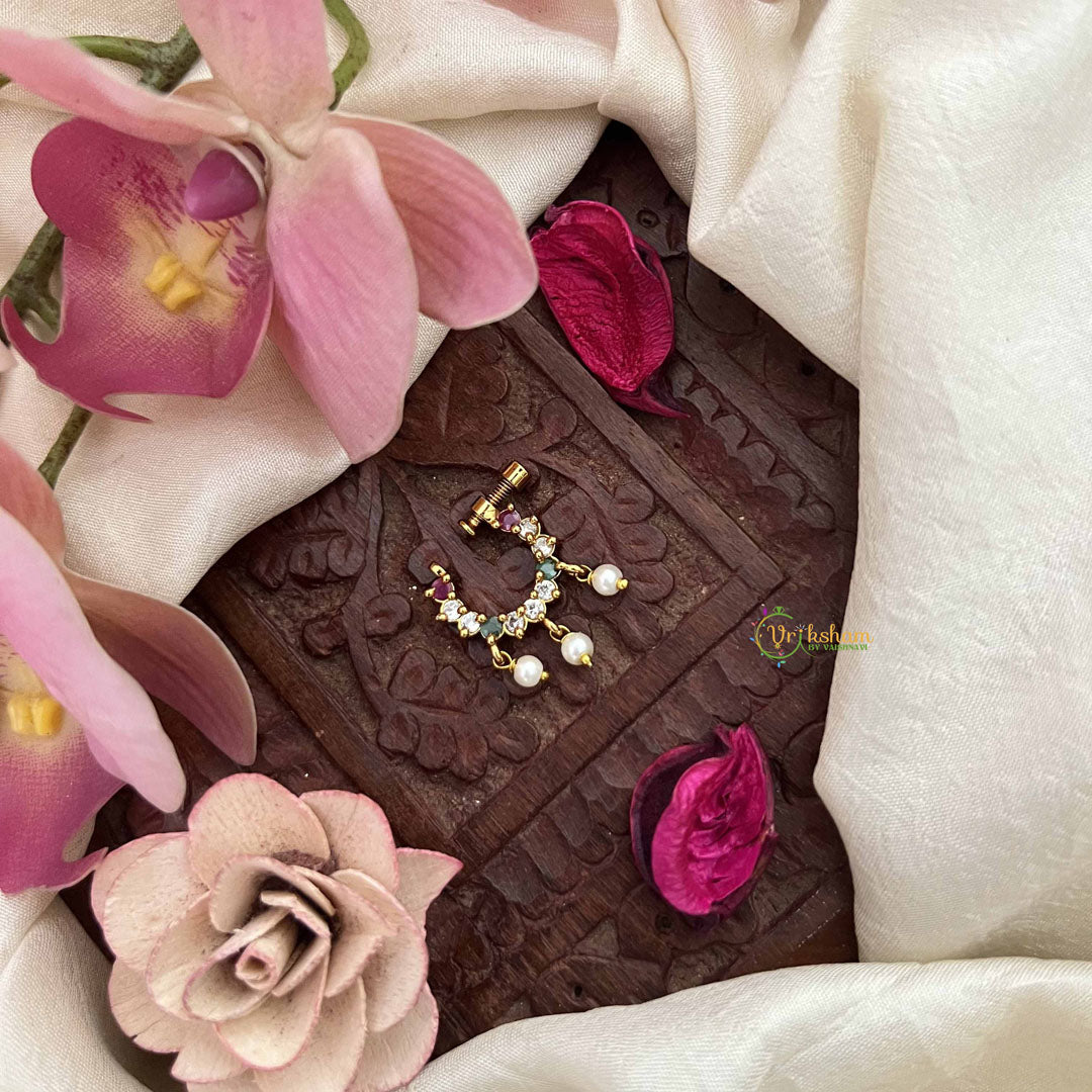 The Vriksham Designer Leaf Style Press Naths in red, white, and green pearls showcases an exquisite leaf motif highlighted by a delicate arrangement of pearls. Crafted for a secure and comfortable press fit, this nose pin infuses vibrant color and timeless elegance, making it an ideal accessory to elevate both traditional and modern ensembles with sophisticated charm.