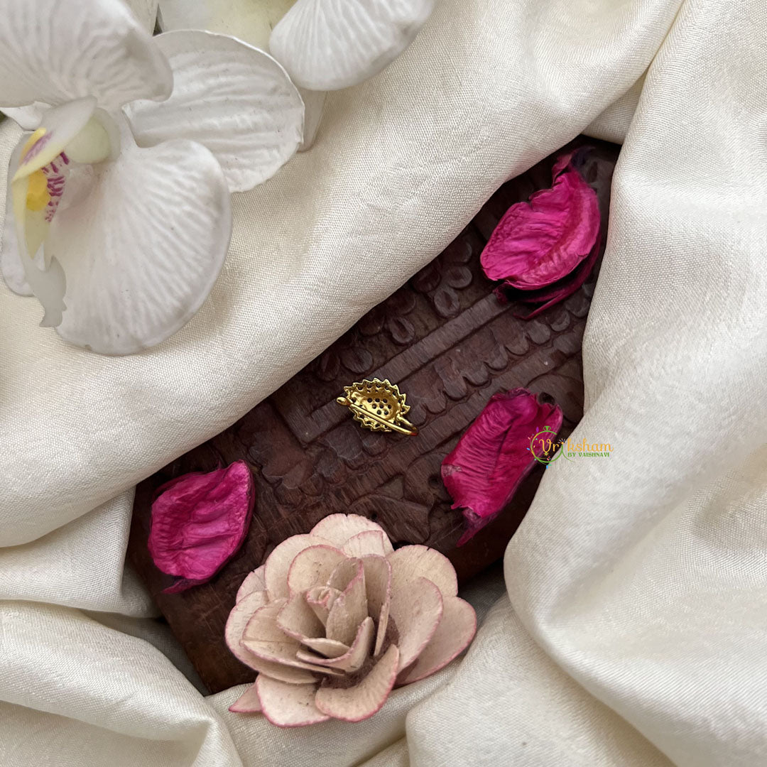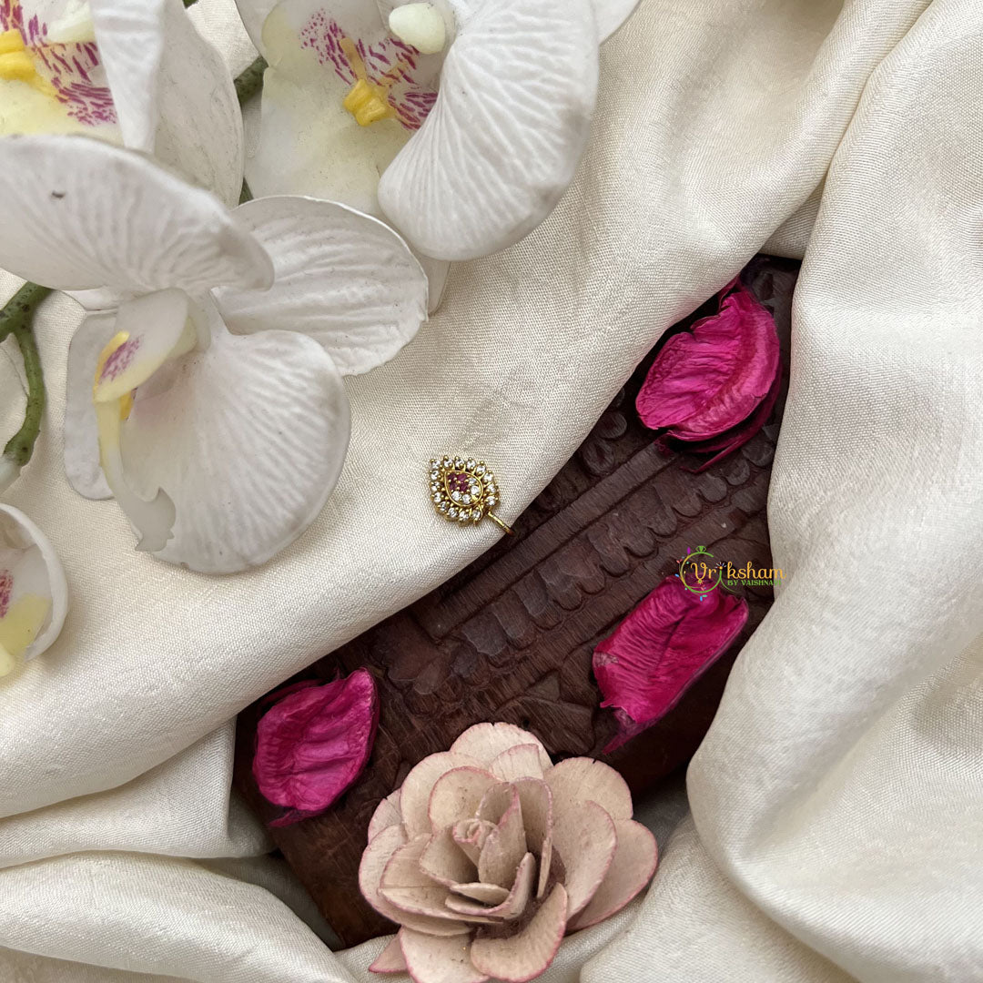 The Vriksham Designer Leaf Style Nose Pin showcases an elegant leaf motif adorned with red white stones. Designed for easy press-on wear, it offers a sophisticated accent that enhances your style with refined charm and subtle beauty.